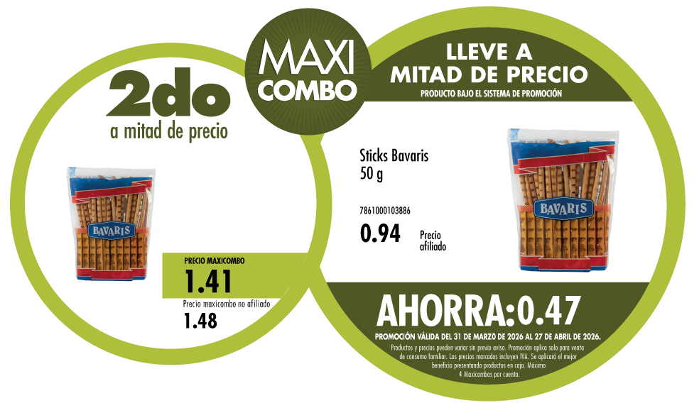 Maxicombo mitad de precio 19. Disponible en nuestros locales. Precio y stock pueden variar según la tienda.