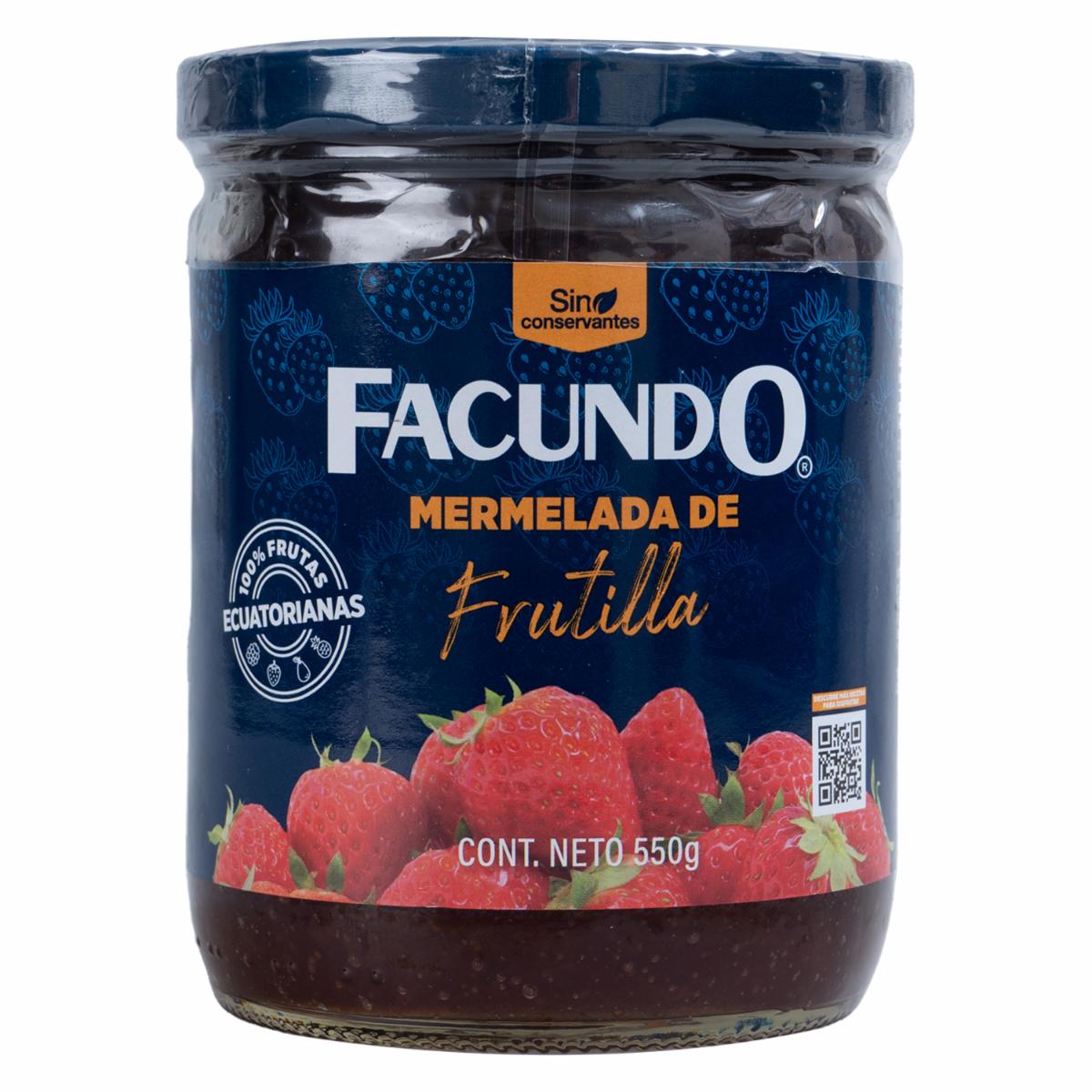 - La mermelada de frutilla Facundo en un envase de 550 gramos es una opción deliciosa para disfrutar del sabor natural y dulce de las fresas,La mermelada de frutilla es un producto que se elabora cocinando fresas frescas con azúcar para crear una mezcla espesa y dulce que es perfecta para untar en pan, galletas, tostadas o para usar como ingrediente en una variedad de recetas de repostería y postres