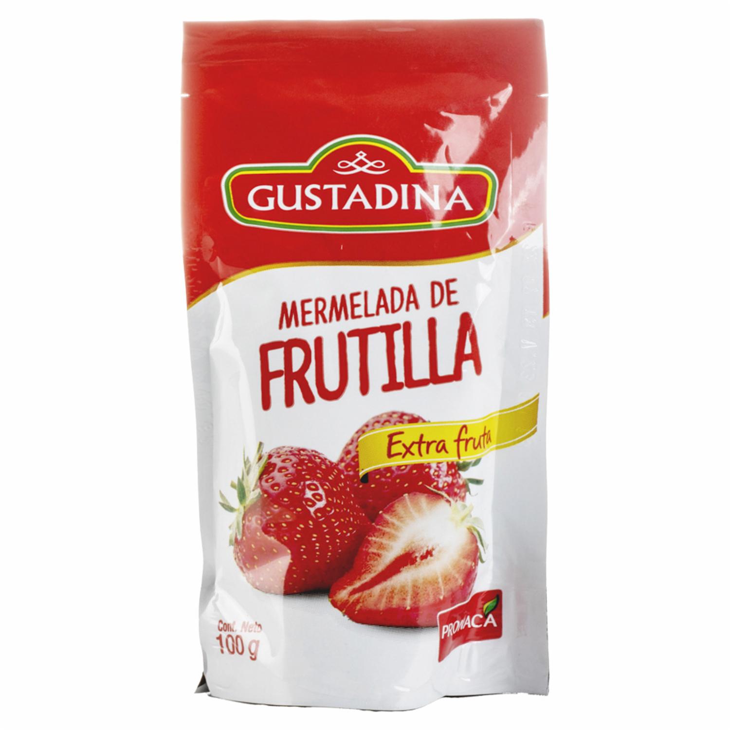 - Deléitate con la dulzura y el sabor vibrante de la Mermelada de Frutilla de GUSTADINA en su presentación de 100 g. Esta mermelada, elaborada con frutillas seleccionadas, es perfecta para untar en pan, galletas, o como ingrediente en postres y preparaciones culinarias