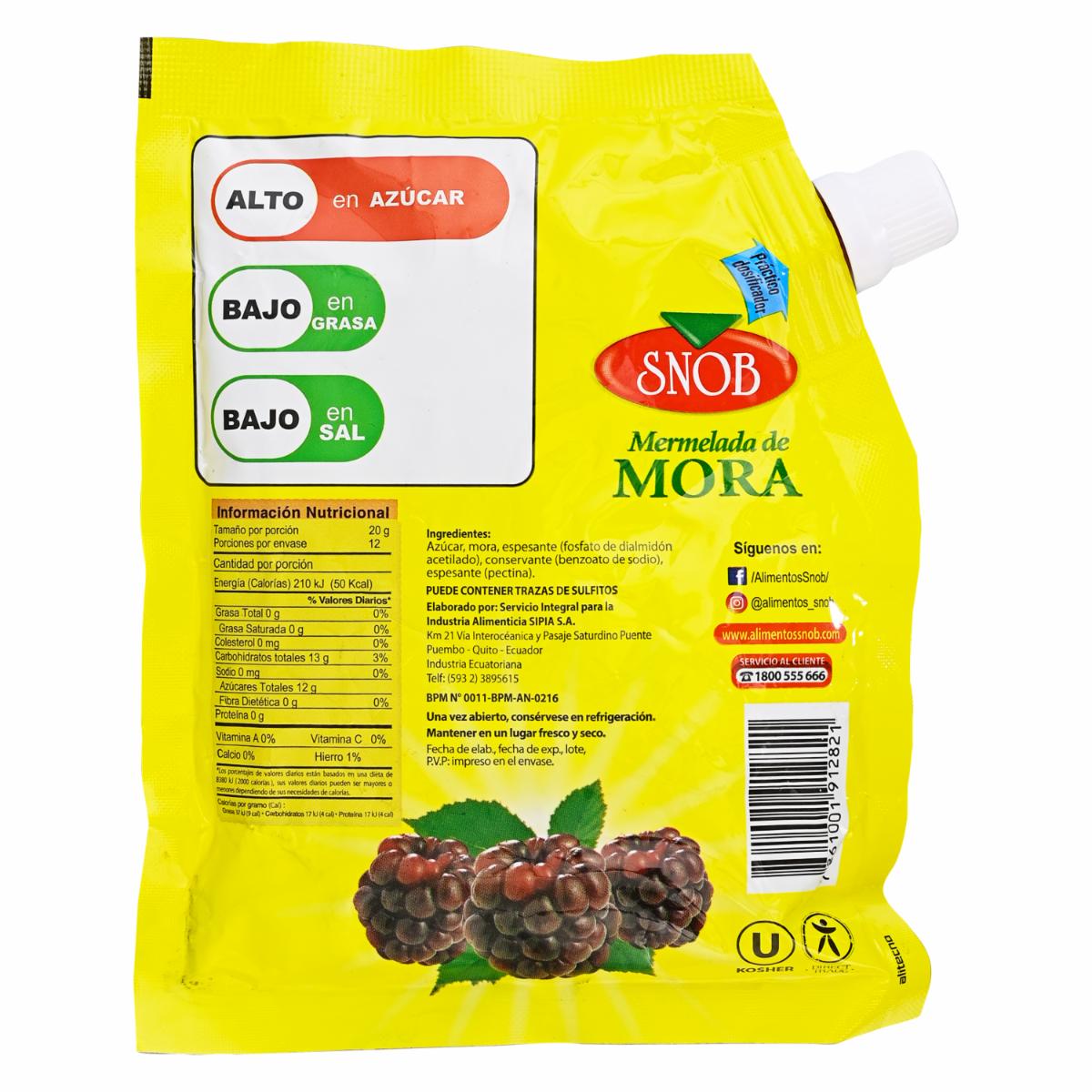 Mermelada De Mora SNOB Doypack – SNOB. Disponible en nuestros locales. Precio y stock pueden variar según la tienda.