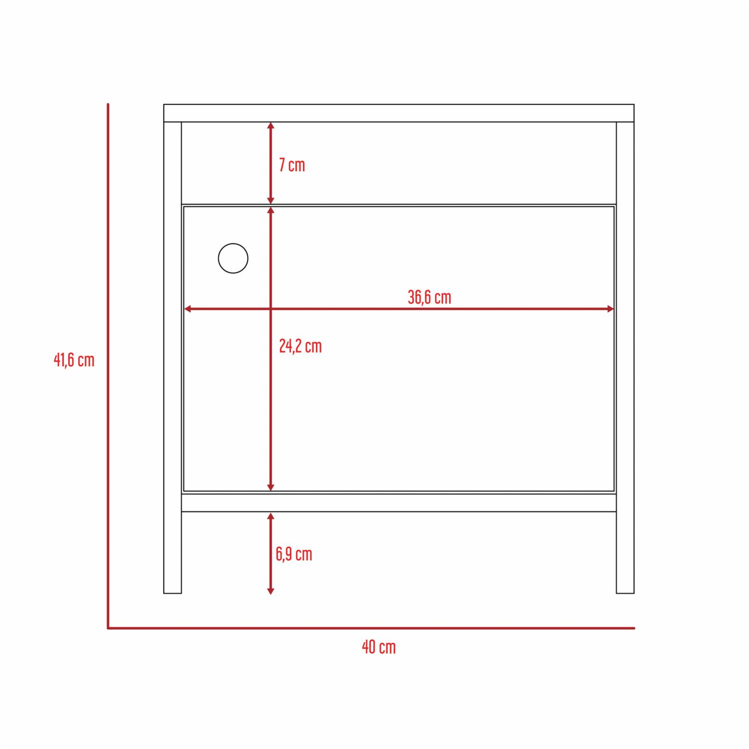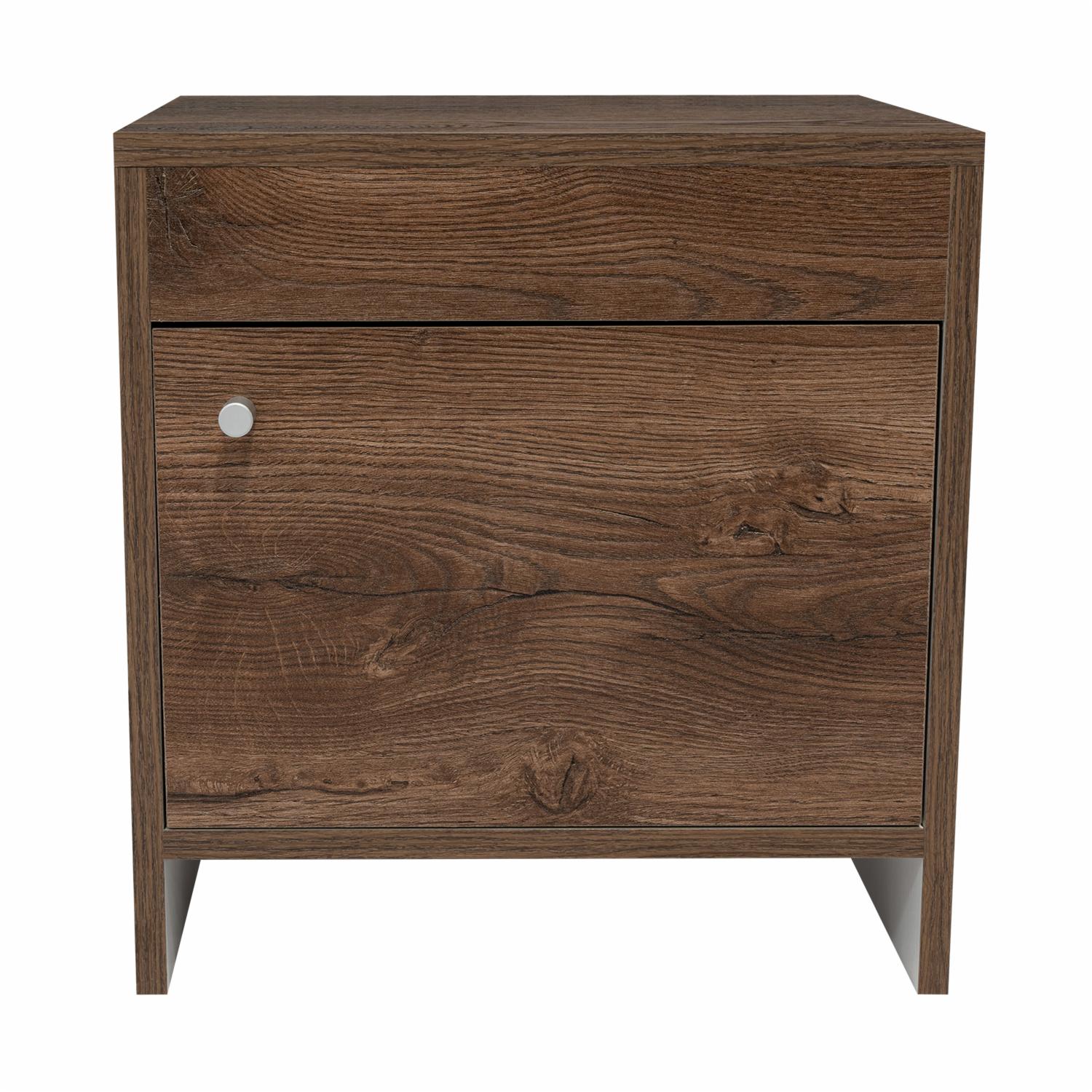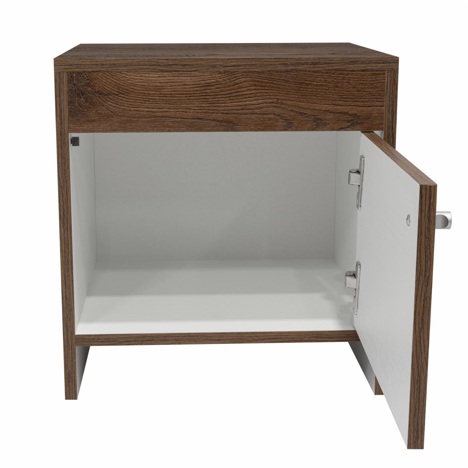 Mesa de Noche con diseño practico, espacio interior para almacenar objetos, una puerta abatible, manija metálica tipo botón, de fácil instalación