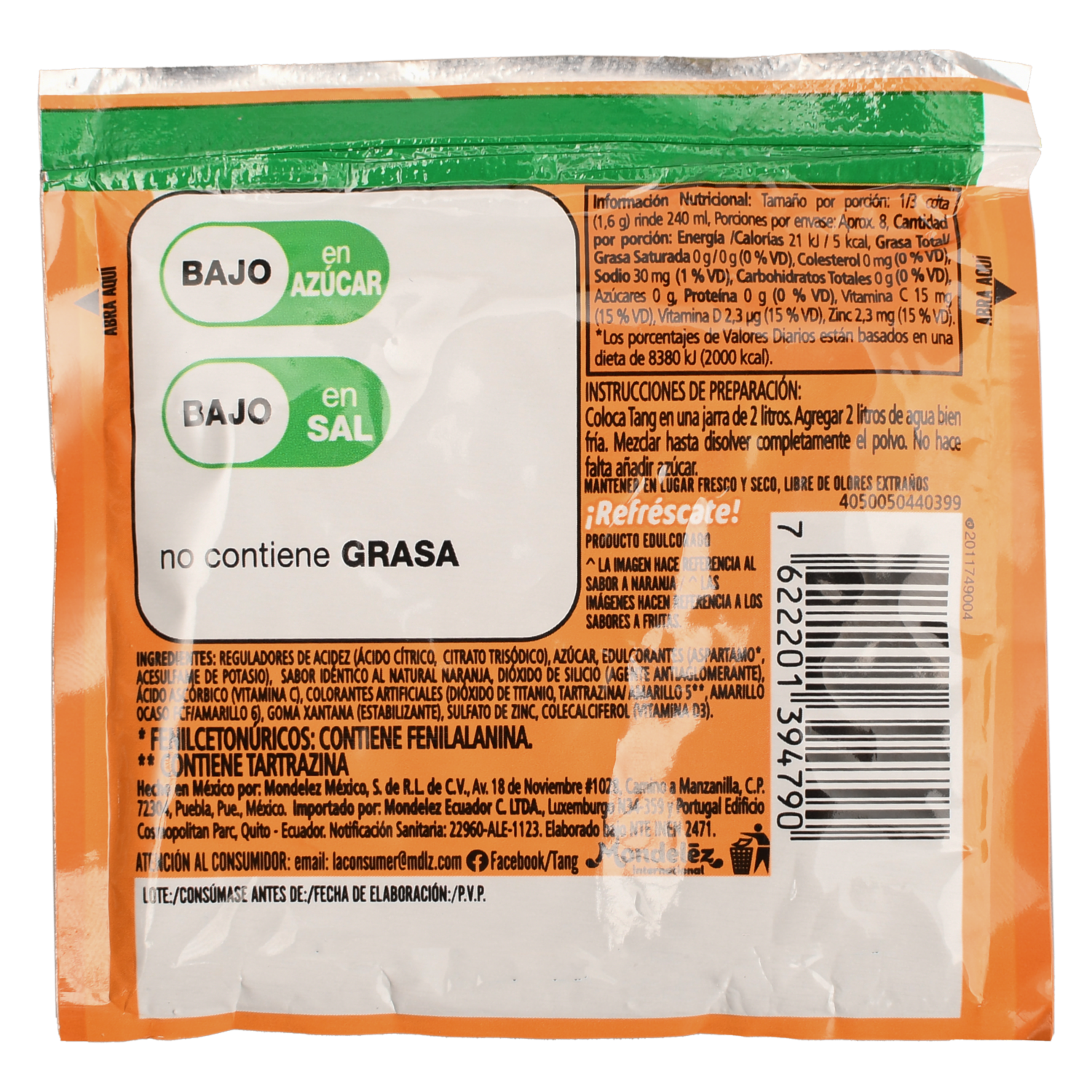 La mezcla en polvo TANG sabor te ofrece una bebida refrescante, dulce y con todo el sabor de la fruta. Ideal para esos días calurosos o como acompañante de cualquier comida. ¡Solo agrega agua y disfruta de la frescura!