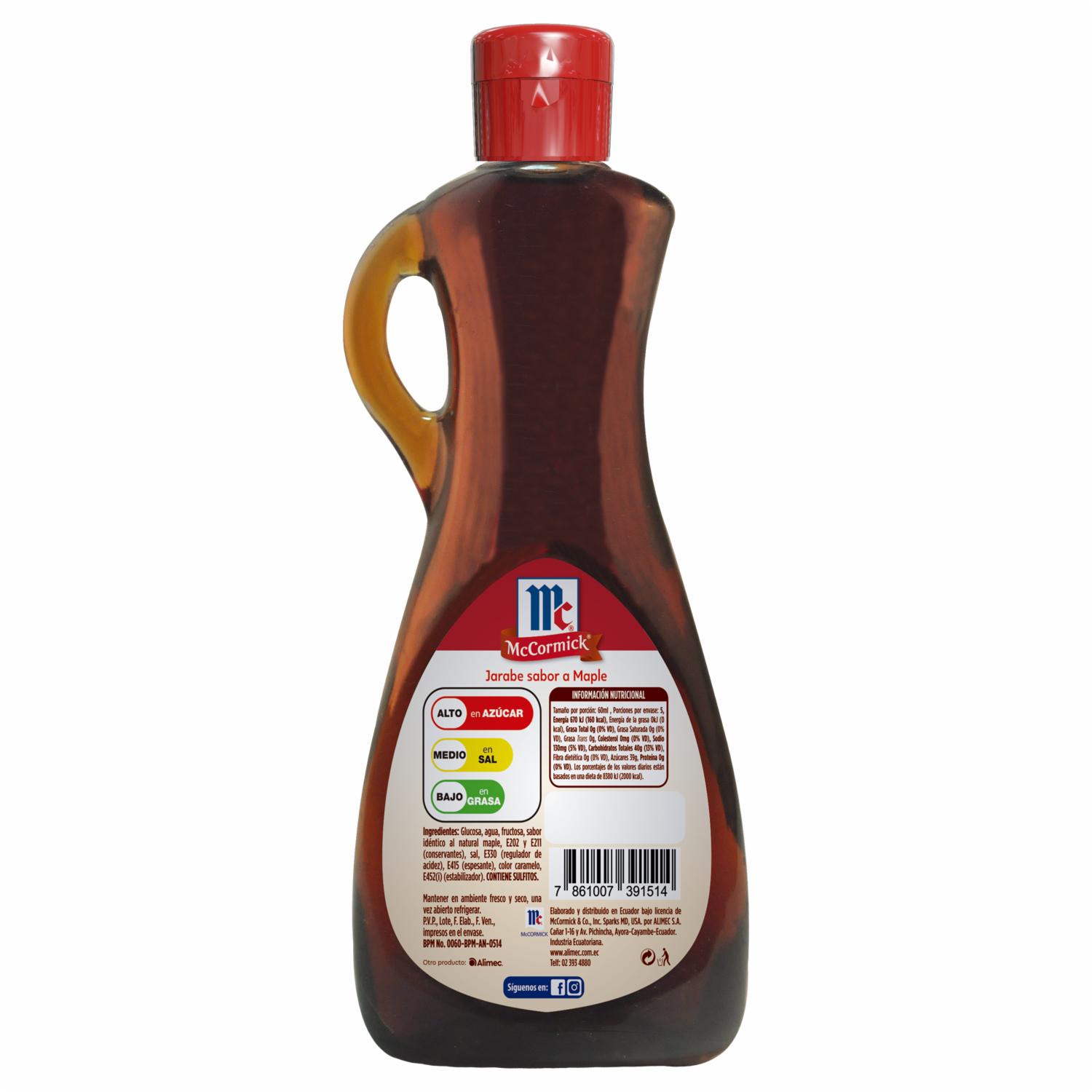 - La Miel De Maple MCCORMICK 300 ml aporta un sabor dulce y natural ideal para tus desayunos y recetas favoritas. Perfecta para pancakes, yogur o como endulzante en bebidas calientes. Disfruta de un toque auténtico y delicioso en cada uso