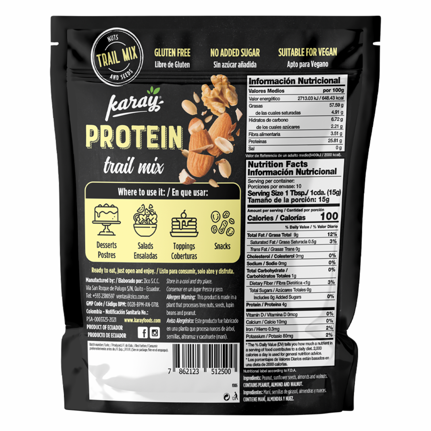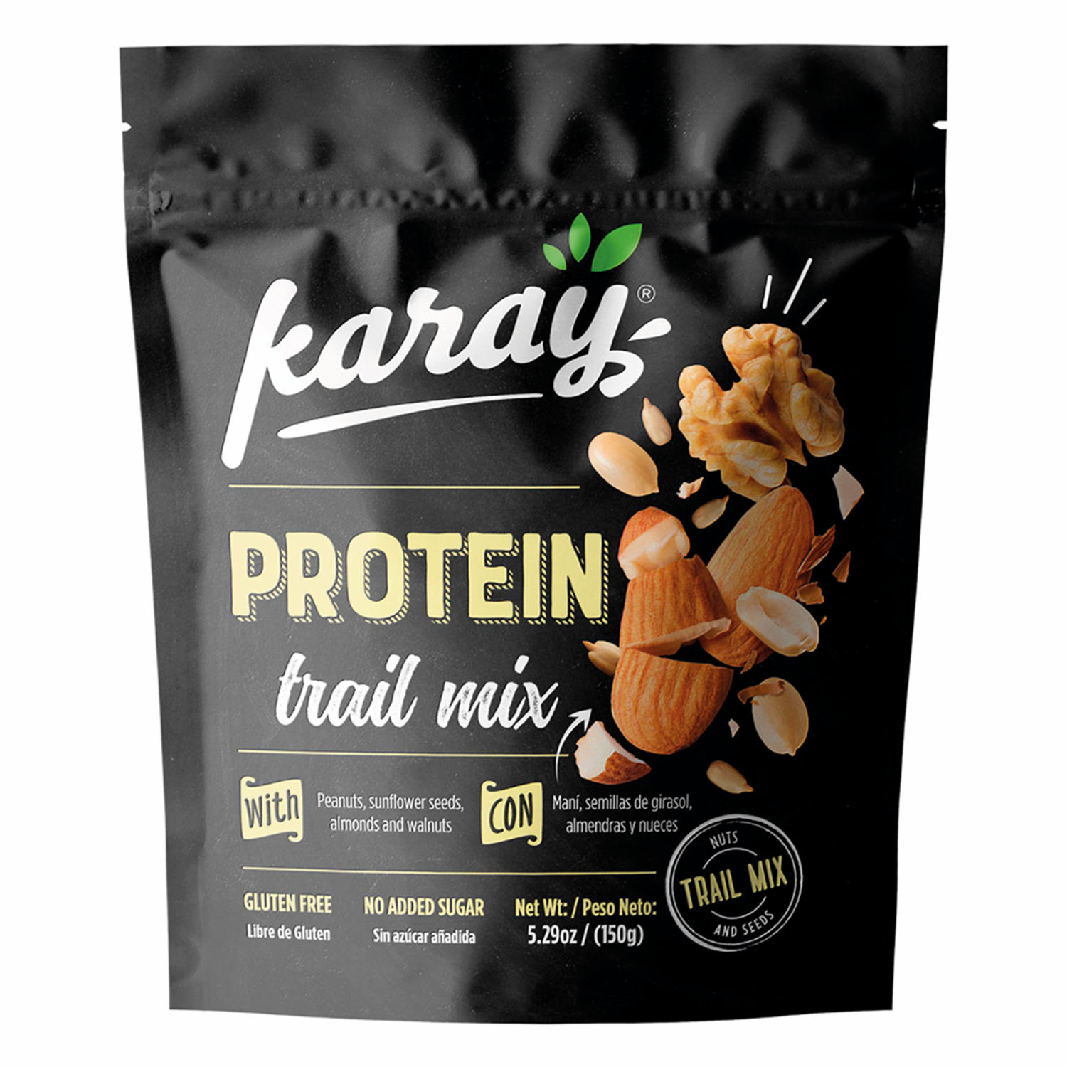 Dale una dosis de energía a tu día a día con el nuevo Trail mix Protein de Karay, disfruta del delicioso mix de maní, semillas de girasol, almendras y nueces, ideal para complementar tu dieta diaria,