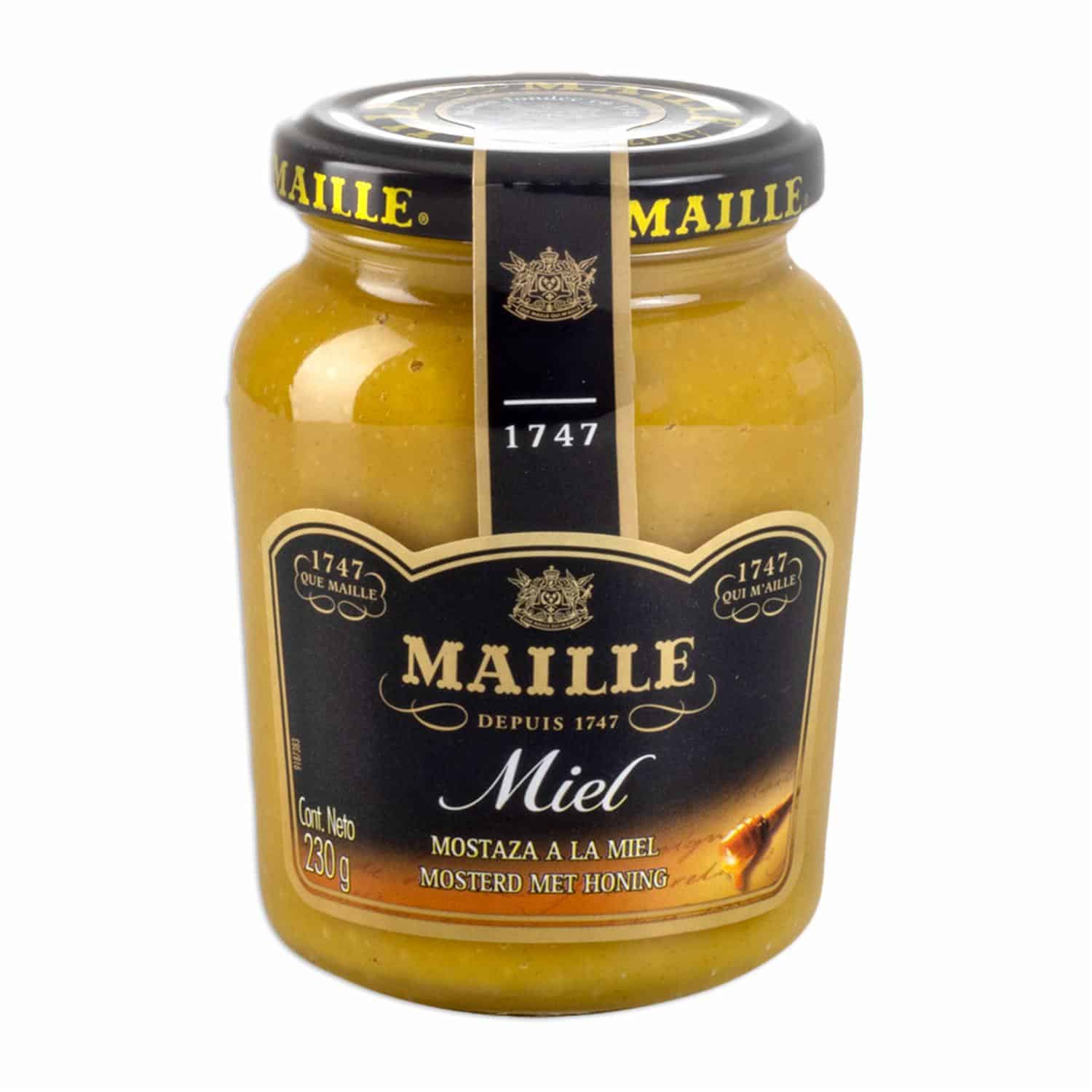 - Sabor a mostaza con un toque de miel. - Textura suave y cremosa. - Ideal para acompañar carnes, ensaladas, sándwiches y otros platillos. - Presentación en frasco de vidrio con tapa hermética para conservar su frescura. - Producto de alta calidad de la marca Maille