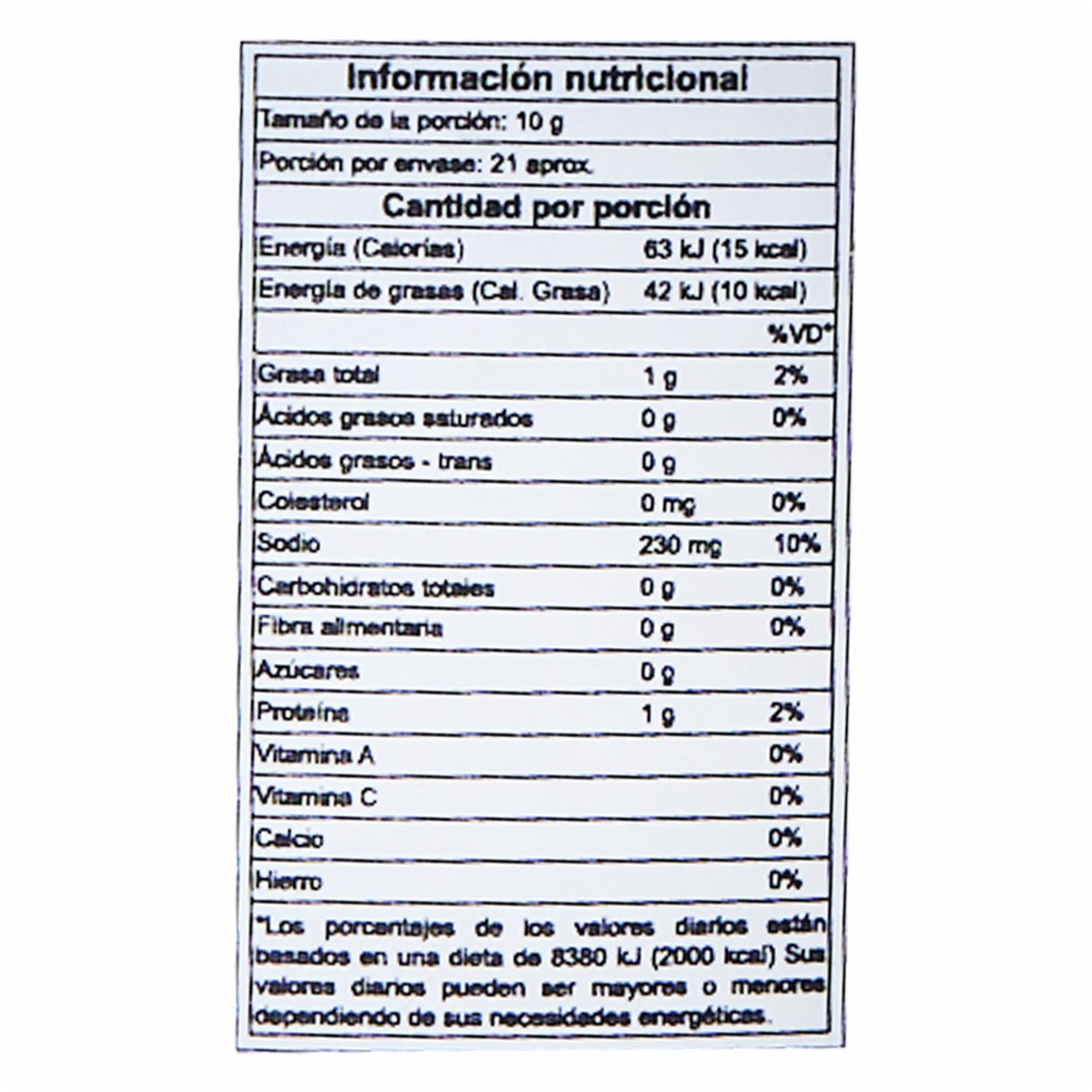 - Sabor fuerte y picante. - Textura suave y cremosa. - Elaborada con ingredientes naturales de alta calidad. - Sin conservantes ni colorantes artificiales. - Apta para veganos y vegetarianos. - Ideal para acompañar carnes, sándwiches, hamburguesas y ensaladas