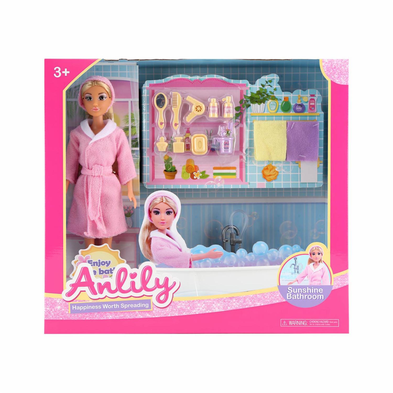 - El set Anlily Sunshine Bathroom convierte la hora del baño en un momento lleno de creatividad con una muñeca en bata, una bañera con burbujas y un completo tocador con cepillos, frascos, toallas y accesorios para una rutina relajante. Los niños pueden imaginar escenas de cuidado personal y diversión mientras crean historias de descanso y estilo. ¡Relájate, juega y brilla con Anlily en Juguetón, donde cada baño se vuelve pura magia refrescante!