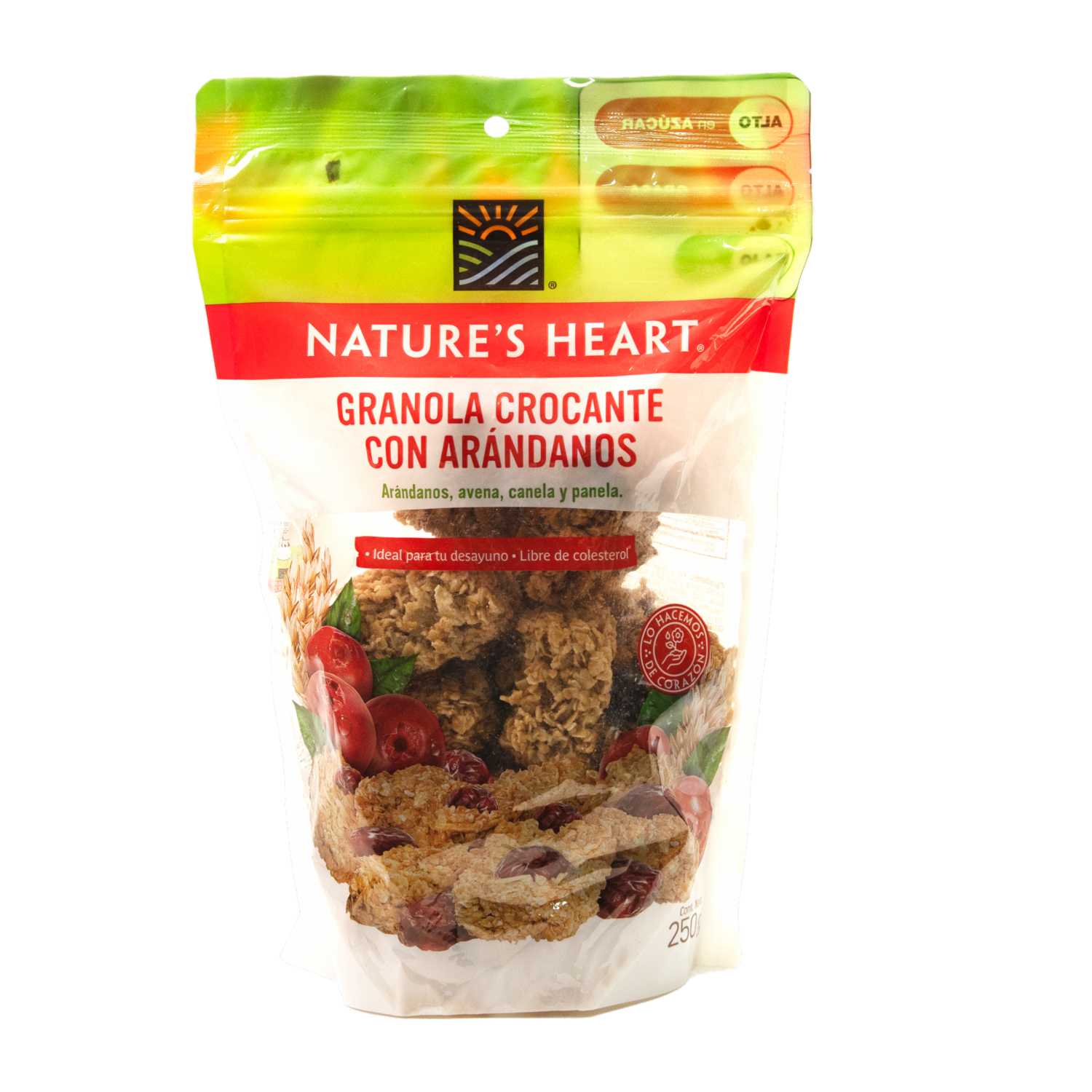 - Granola Crocante Arandano NATURES HEART 250 g Mezcla avena con arandanos, ideal para un desayuno saludable que brinda energia, fibra y un sabor ligeramente dulce en cada porcion diaria