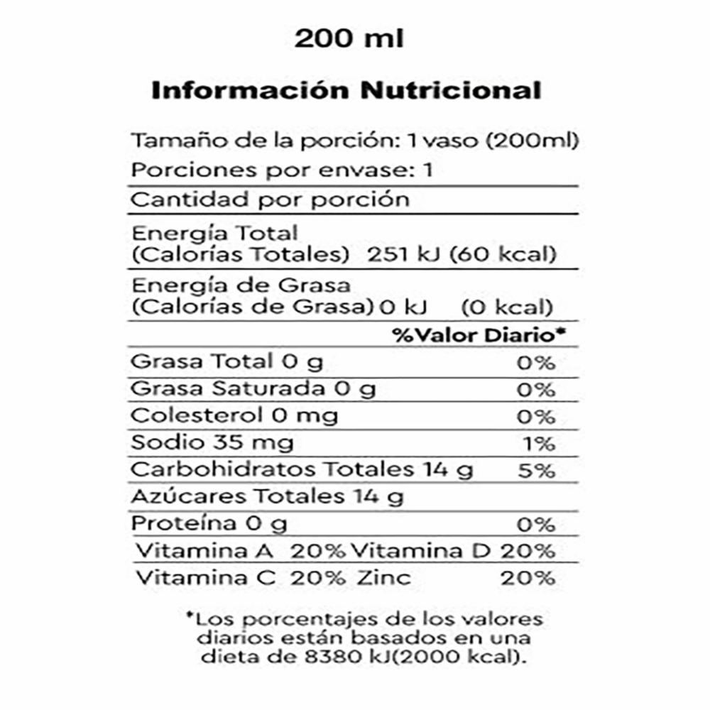 Jugo de manzana (concentrado clarificado de manzana y agua para reconstitución), agua, azúcar, regulador de acidez (ácido málico), estabilizante (pectina), aroma natural de manzana, vitaminas (A, C y D), Sulfato de Zinc y edulcorante (sucralosa). sin saborizantes artificiales