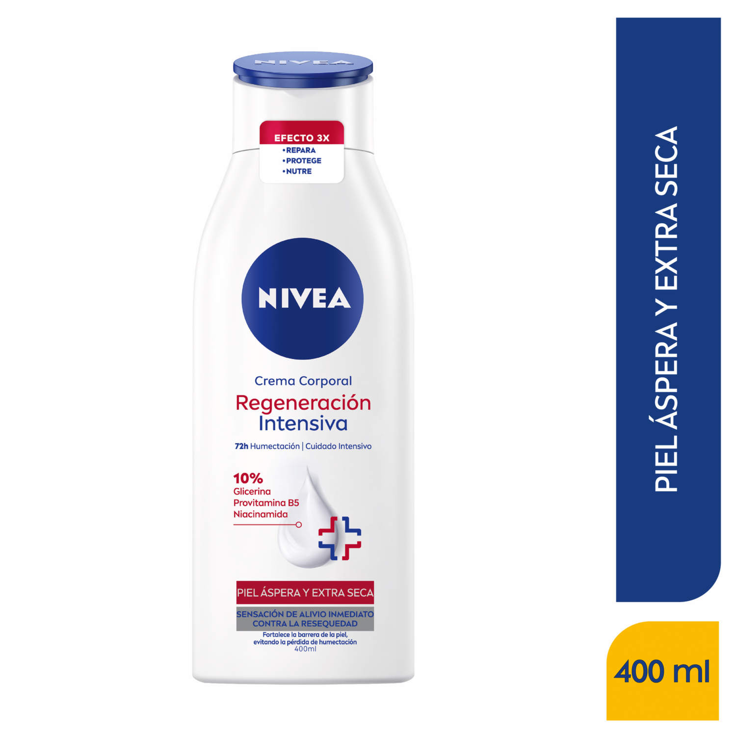 - Nivea Crema Corporal Regeneración Intensiva 400ml: para piel áspera y extra seca, con glicerina, provitamina B5 y niacinamida que alivian, regeneran y humectan 72h