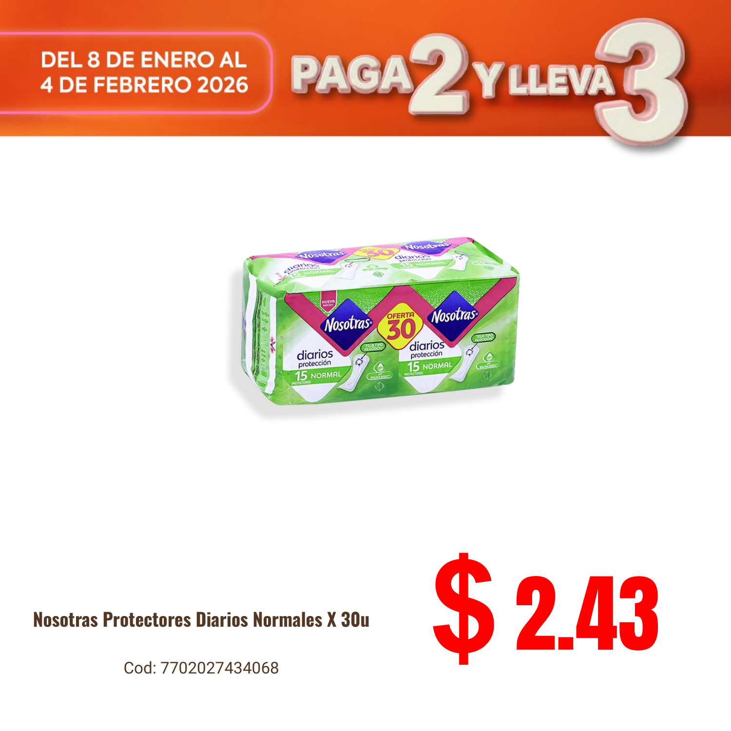 Nosotras Protectores Diarios Normales X 30u. Disponible en nuestros locales. Precio y stock pueden variar según la tienda.