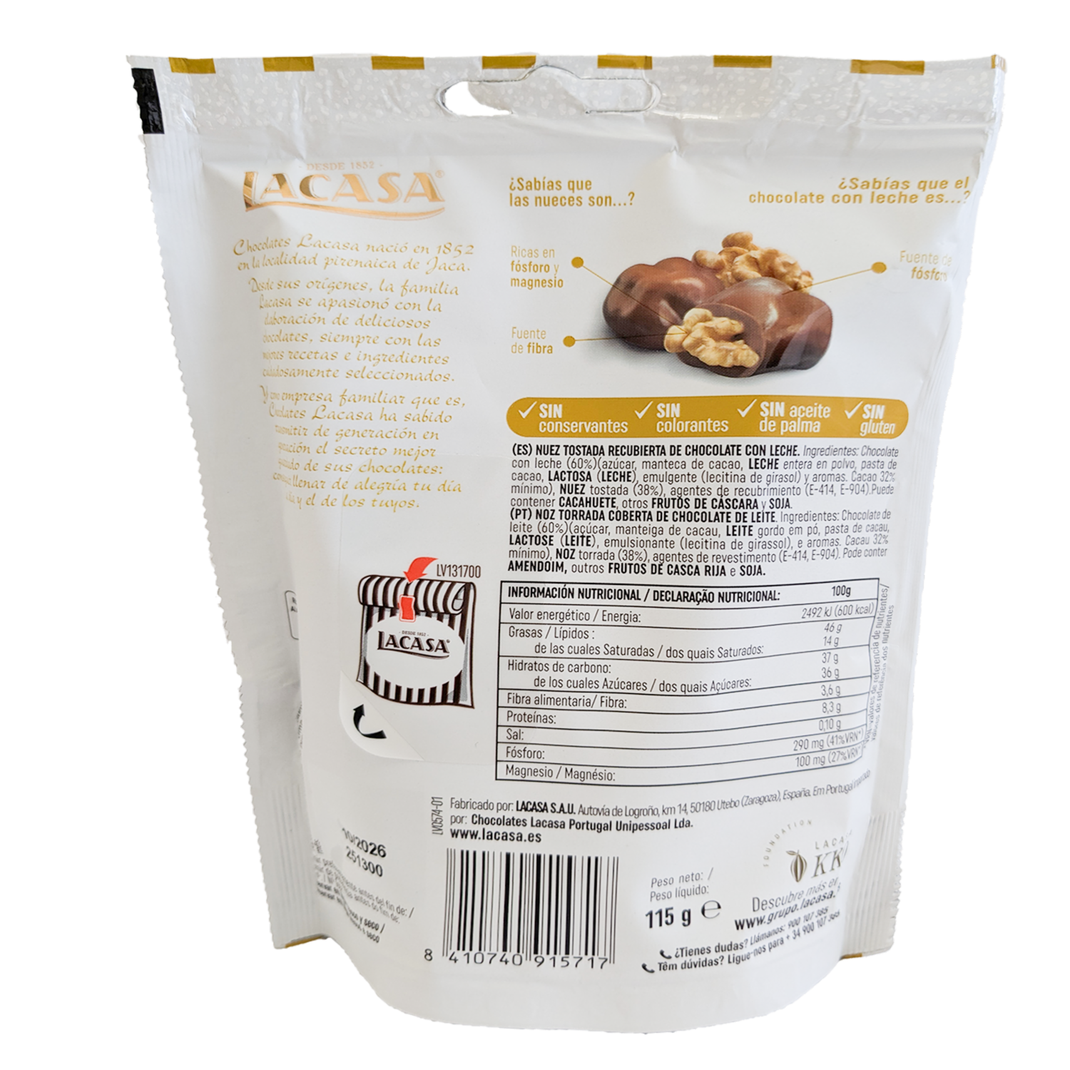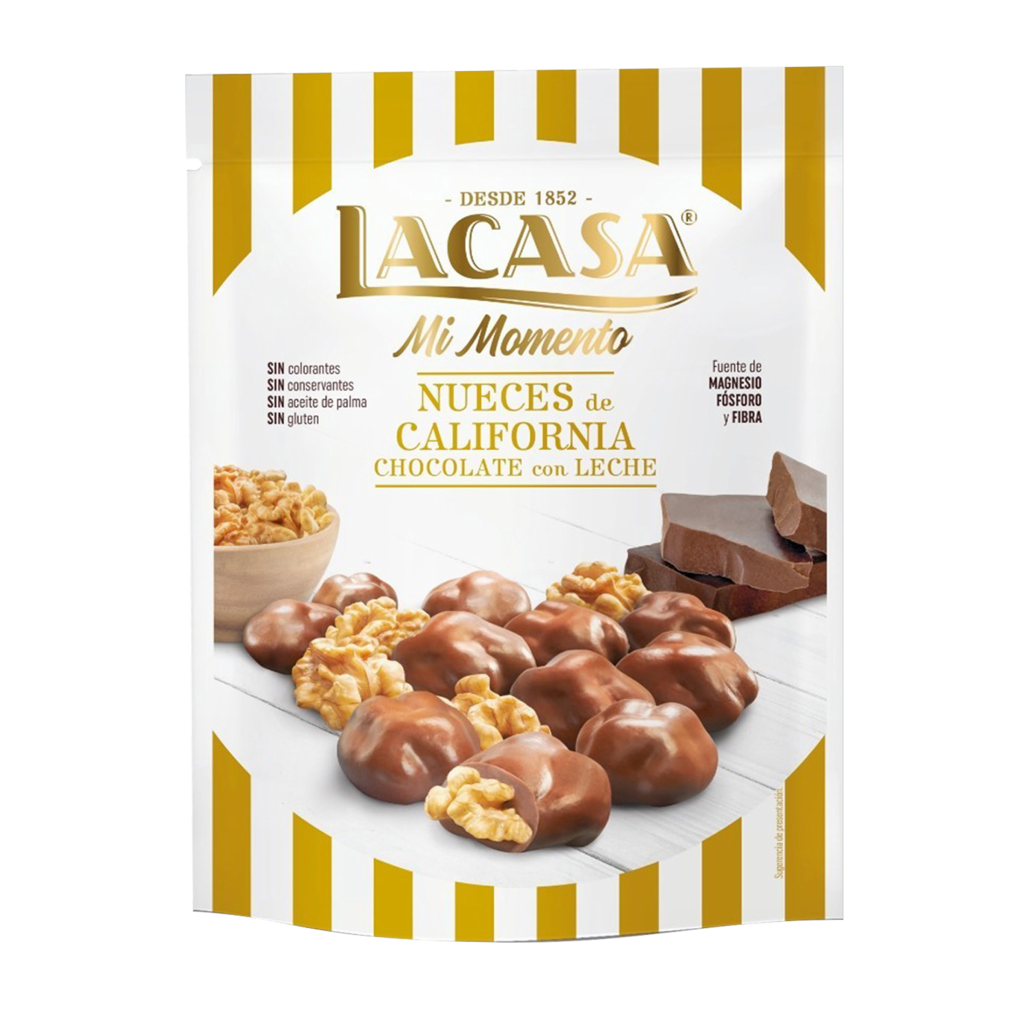 - Las nueces de california recubiertas de chocolate con leche son fuente de magnesio, fósforo y fibra. Sin gluten, sin colorantes, sin aceite de palma y sin conservantes