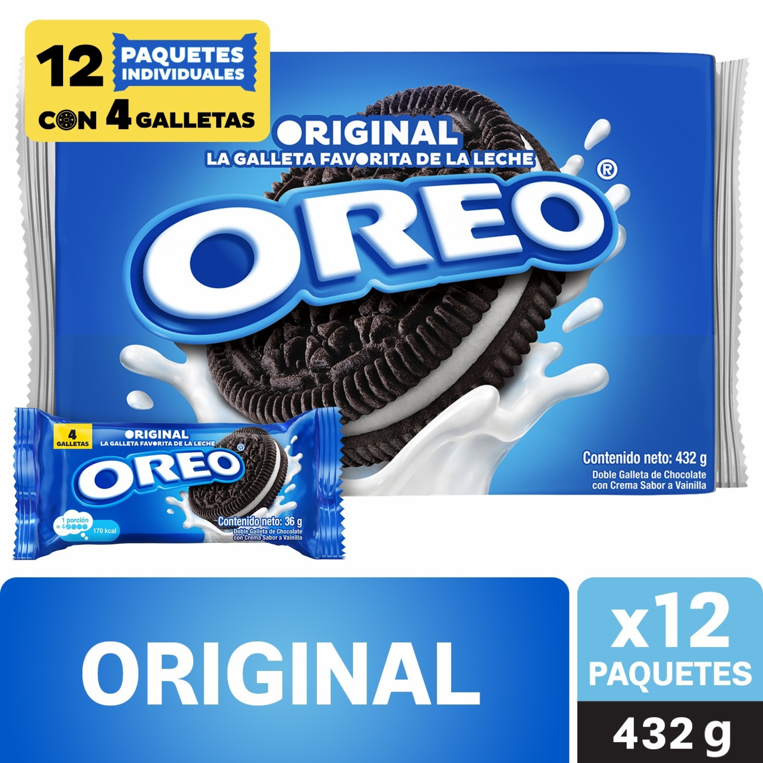 Galletas Oreo Originales de chocolate rellenas con crema sabor vainilla en formato 12pack x 36g c/u 4 galletas cada uno para llevar donde quieras