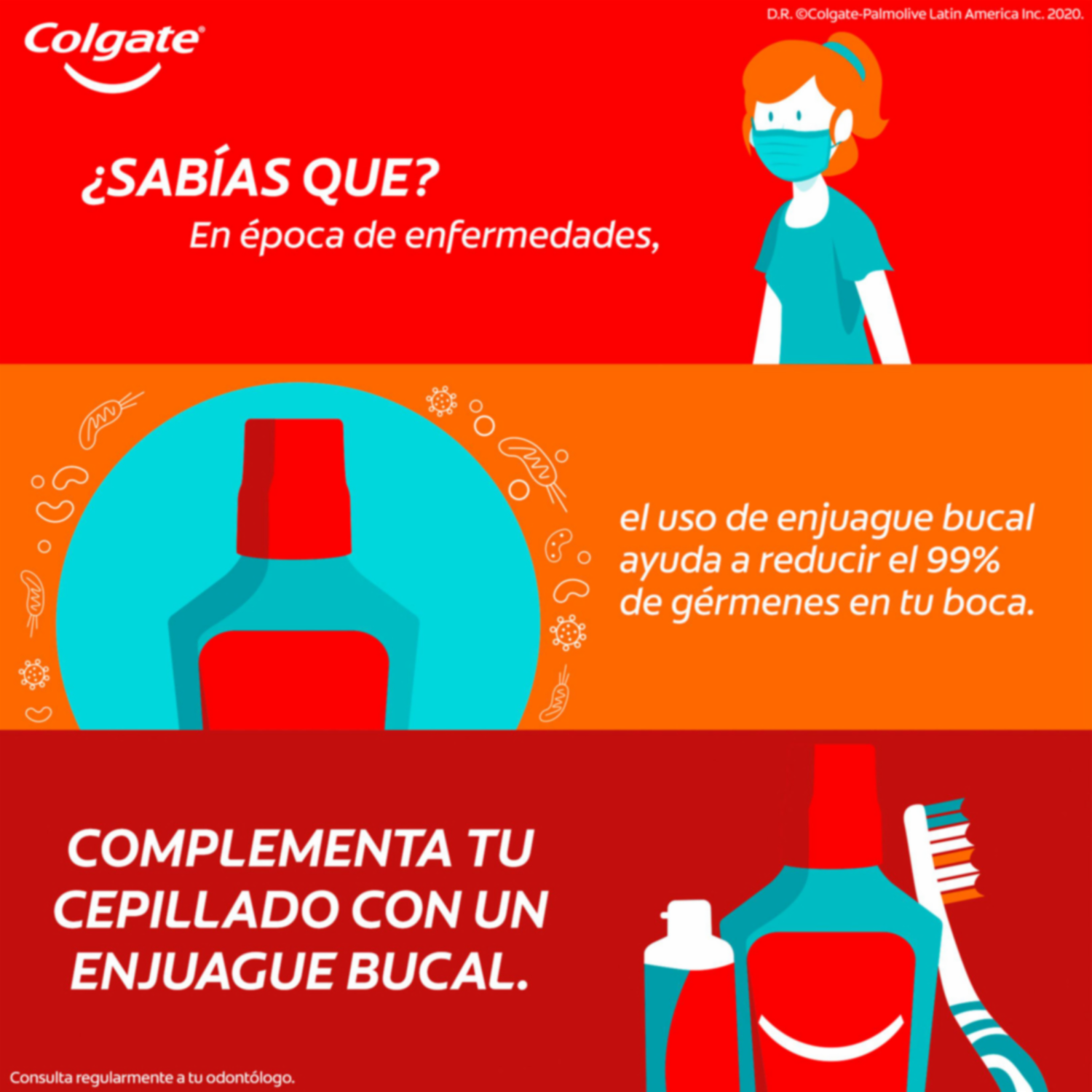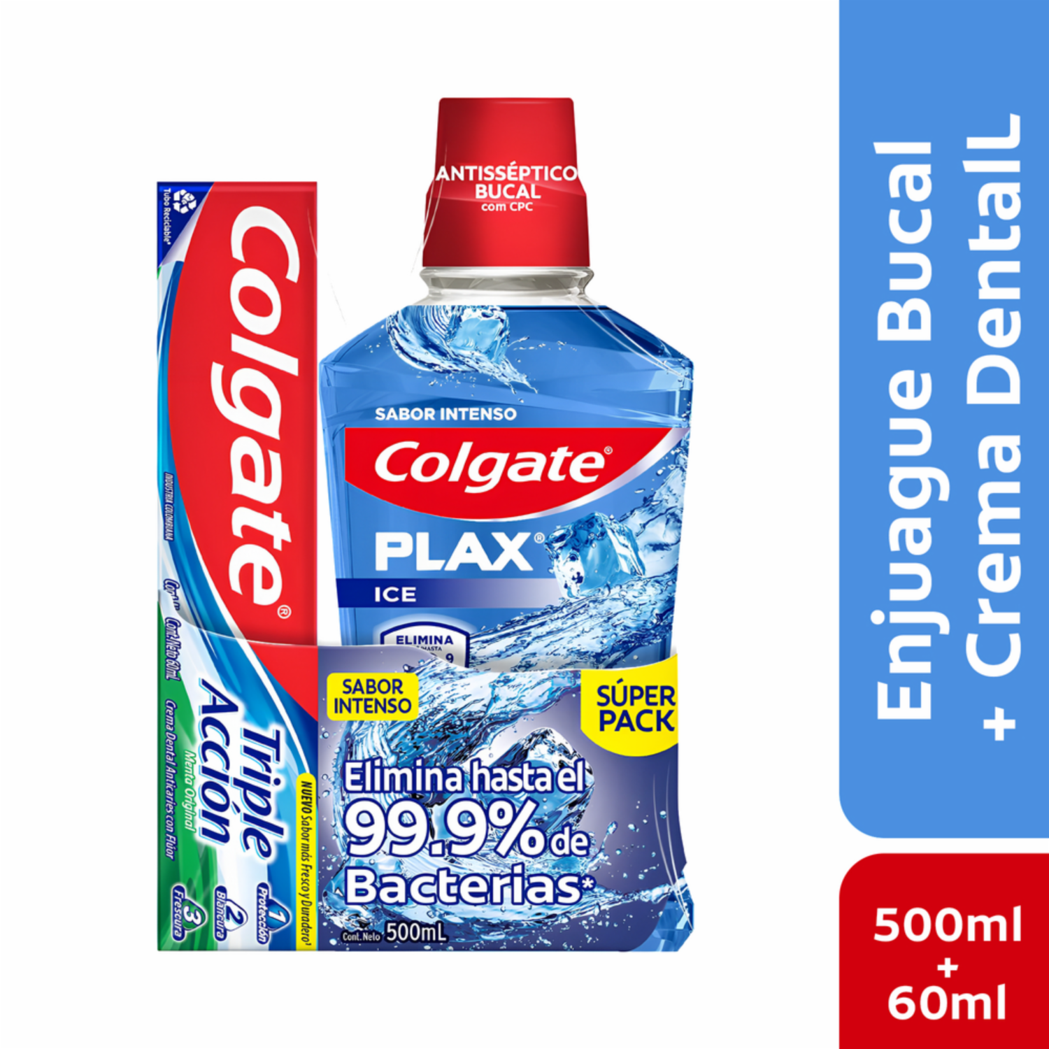 - Enjuague bucal: Experimenta una suave frescura con el enjuague bucal Colgate Plax Ice con la eficacia del CPC, ingrediente que elimina hasta el 99.9% de las bacterias* contribuyendo a una boca sana con aliento fresco