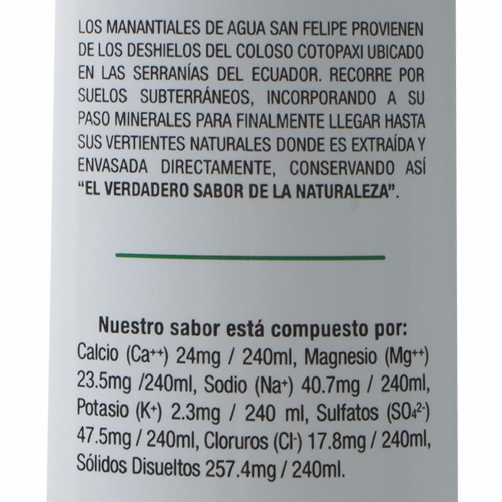 Agua mineral San Felipe con gas, proviene de los deshielos del coloso volcán Cotopaxi, ubicado en las serranías del Ecuador, recorriendo los suelos subterráneos e incorporando a su paso un sinfín de minerales, tales como: calcio, potasio y magnesio; llega a sus vertientes naturales en Latacunga, donde se desarrolla el proceso de extracción