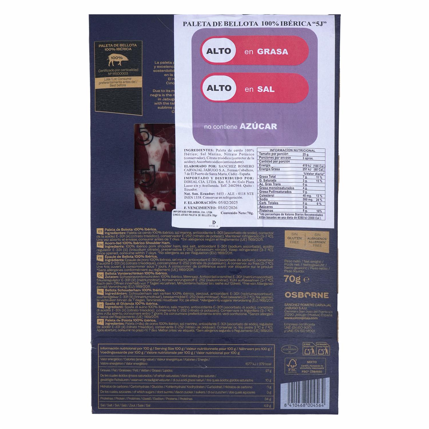 Paleta De Bellota Ibérica CINCO JOTAS 70 G – CINCO JOTAS. Disponible en nuestros locales. Precio y stock pueden variar según la tienda.