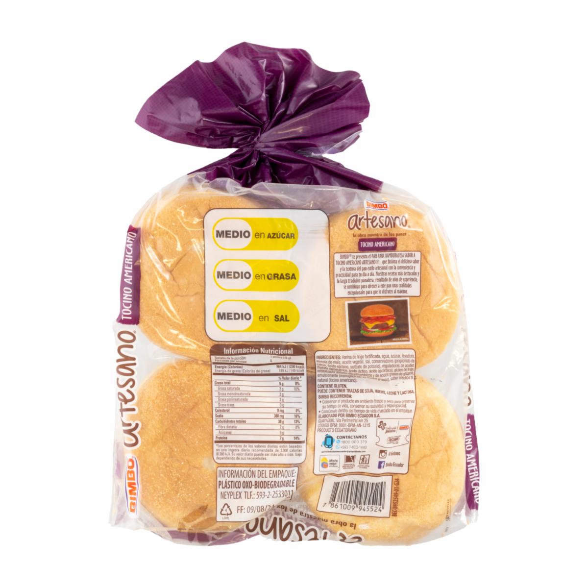 Pan De Hamburguesa Artesano Tocino BIMBO 310 G – BIMBO. Disponible en nuestros locales. Precio y stock pueden variar según la tienda.