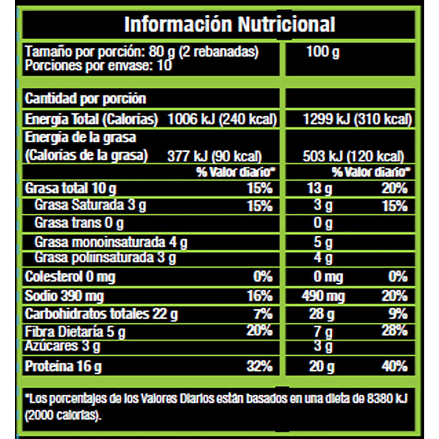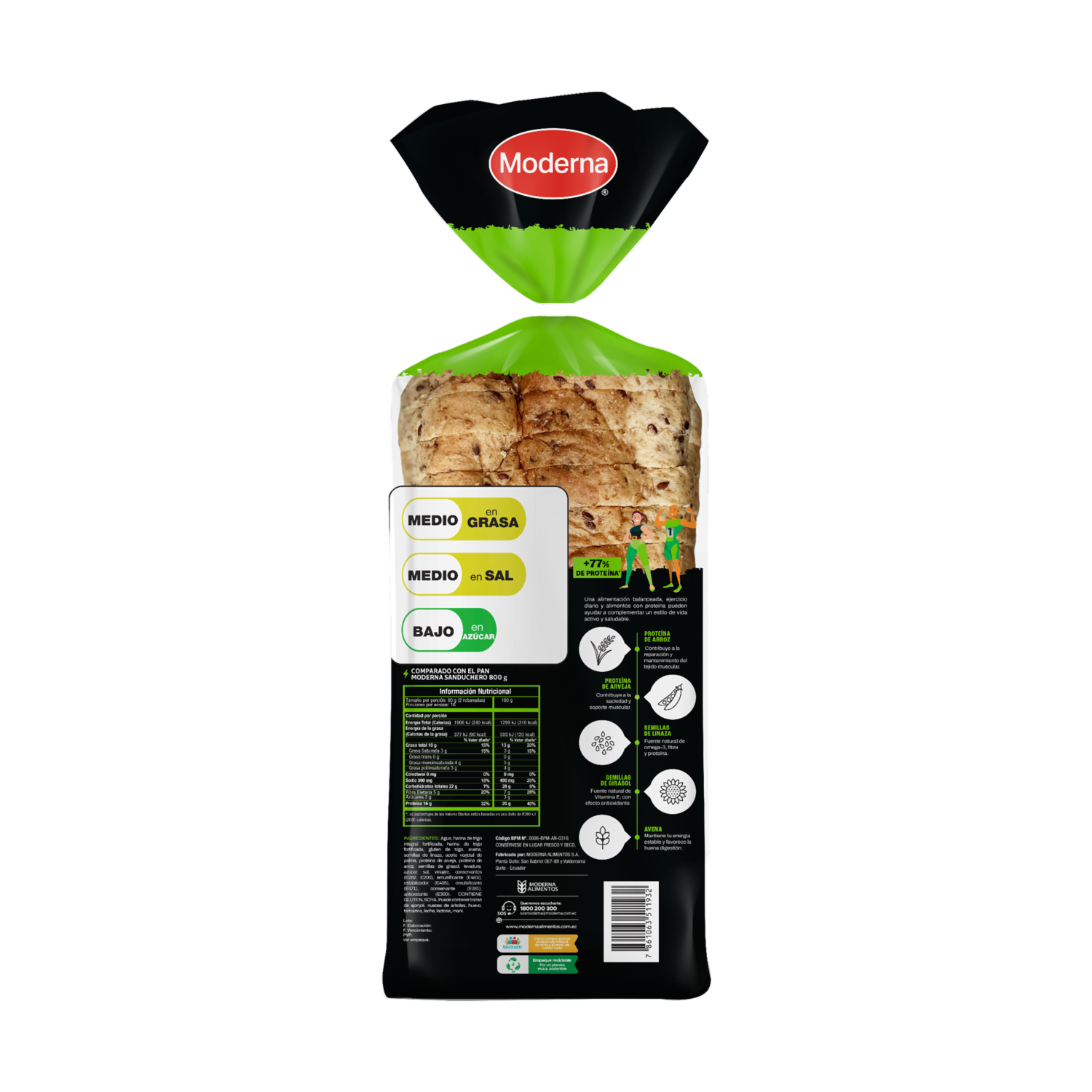 - Te brinda un extra de proteína en el pan de siempre. Aporta 20 g de proteína por porción (2 rebanadas), ayudándote a mantener la energía y la saciedad por más tiempo, apoya el desarrollo, la fuerza y la recuperación muscular. Elaborado con proteína vegetal de arveja y arroz, combina funcionalidad y nutrición sin renunciar a la textura suave ni al buen sabor, con semillas de linaza y girasol, que refuerzan su aporte funcional y nutricional