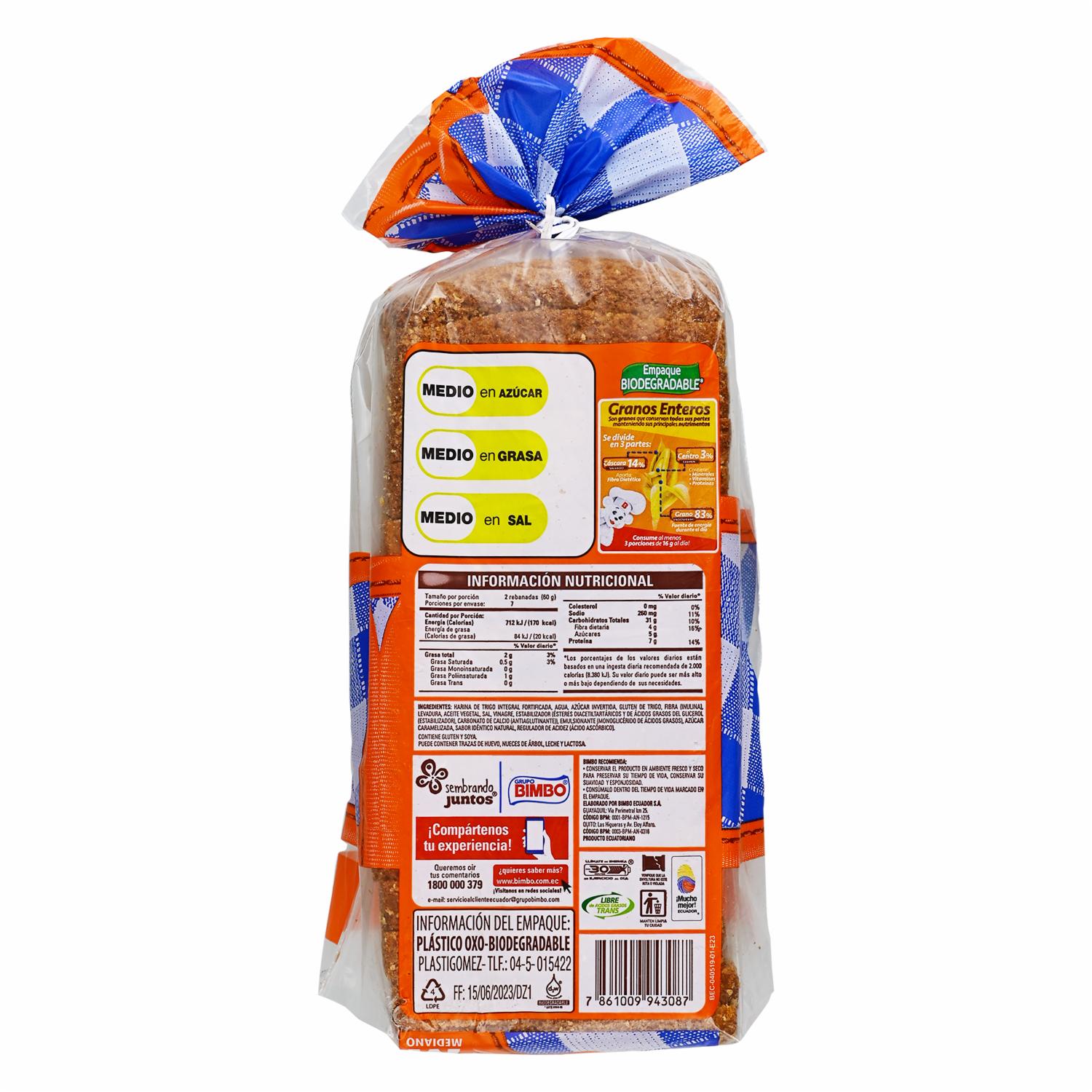 Pan Integral Medio Molde BIMBO Funda – BIMBO. Disponible en nuestros locales. Precio y stock pueden variar según la tienda.