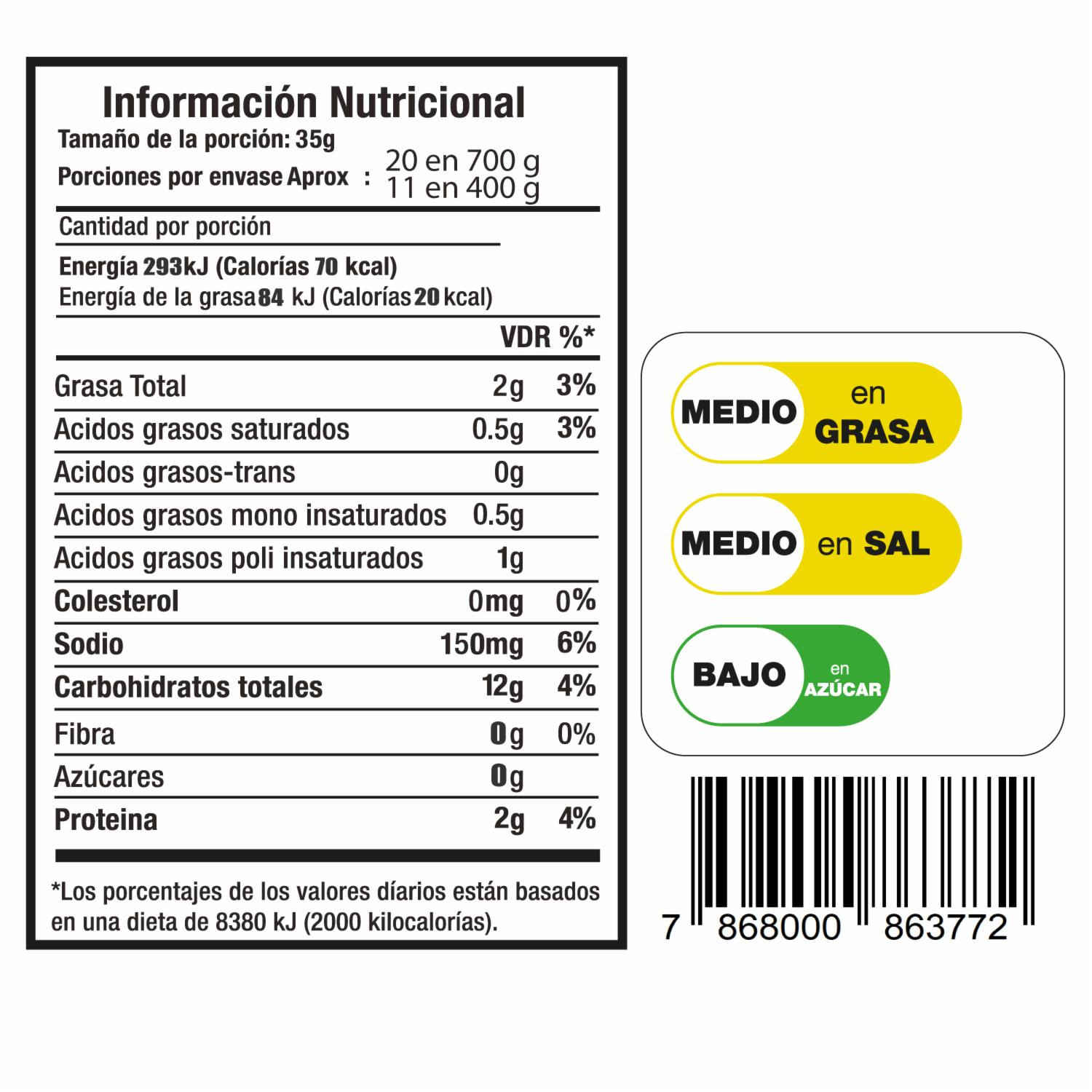 No contiene gluten, leche, huevo, ni soya. Es low carb, bajo en azúcar. 15 unidades. Tiempo de consumo 3o días, conservar en clima fresco y seco
