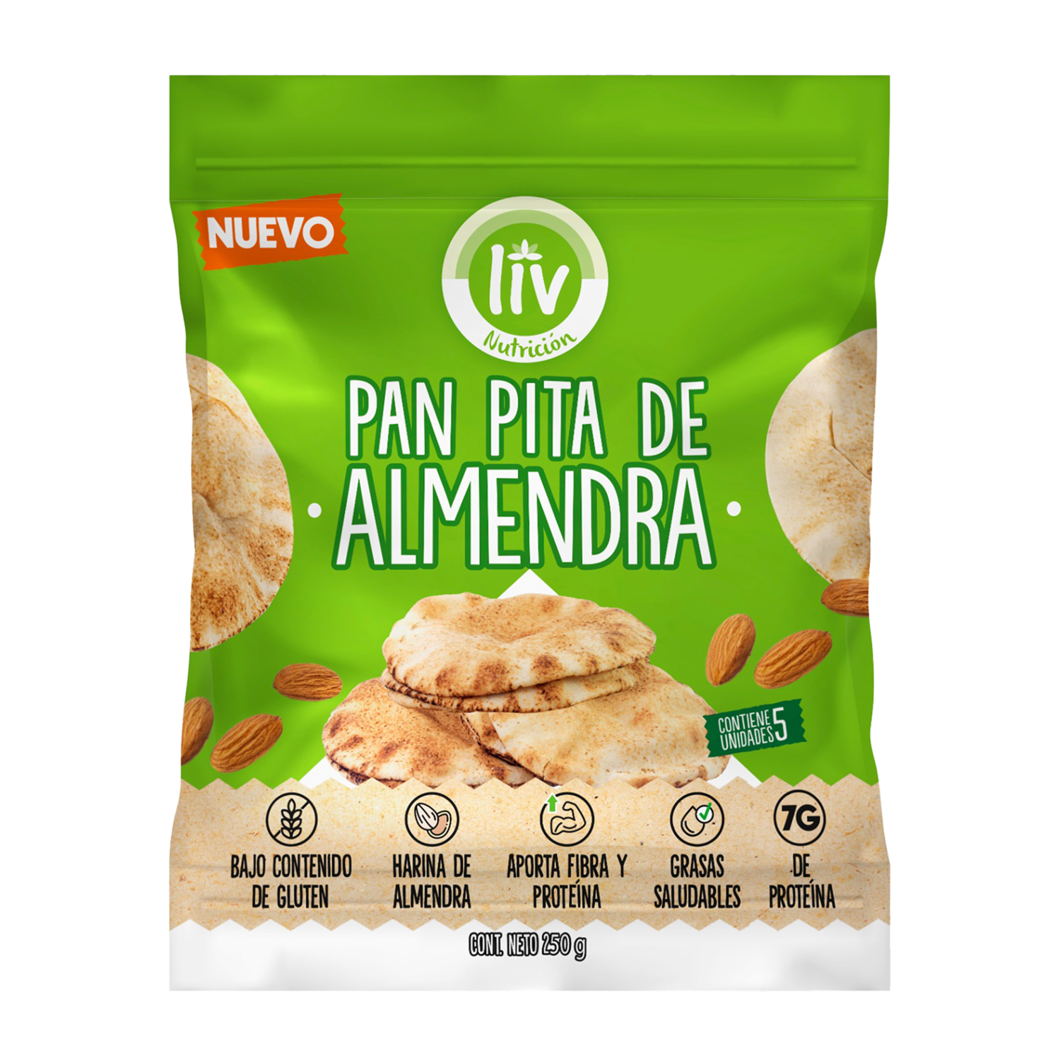 Liv pan pita con harina de lamendra, bajo en gluten, vegano, aporta fibra y proteína, libre de mantequilla