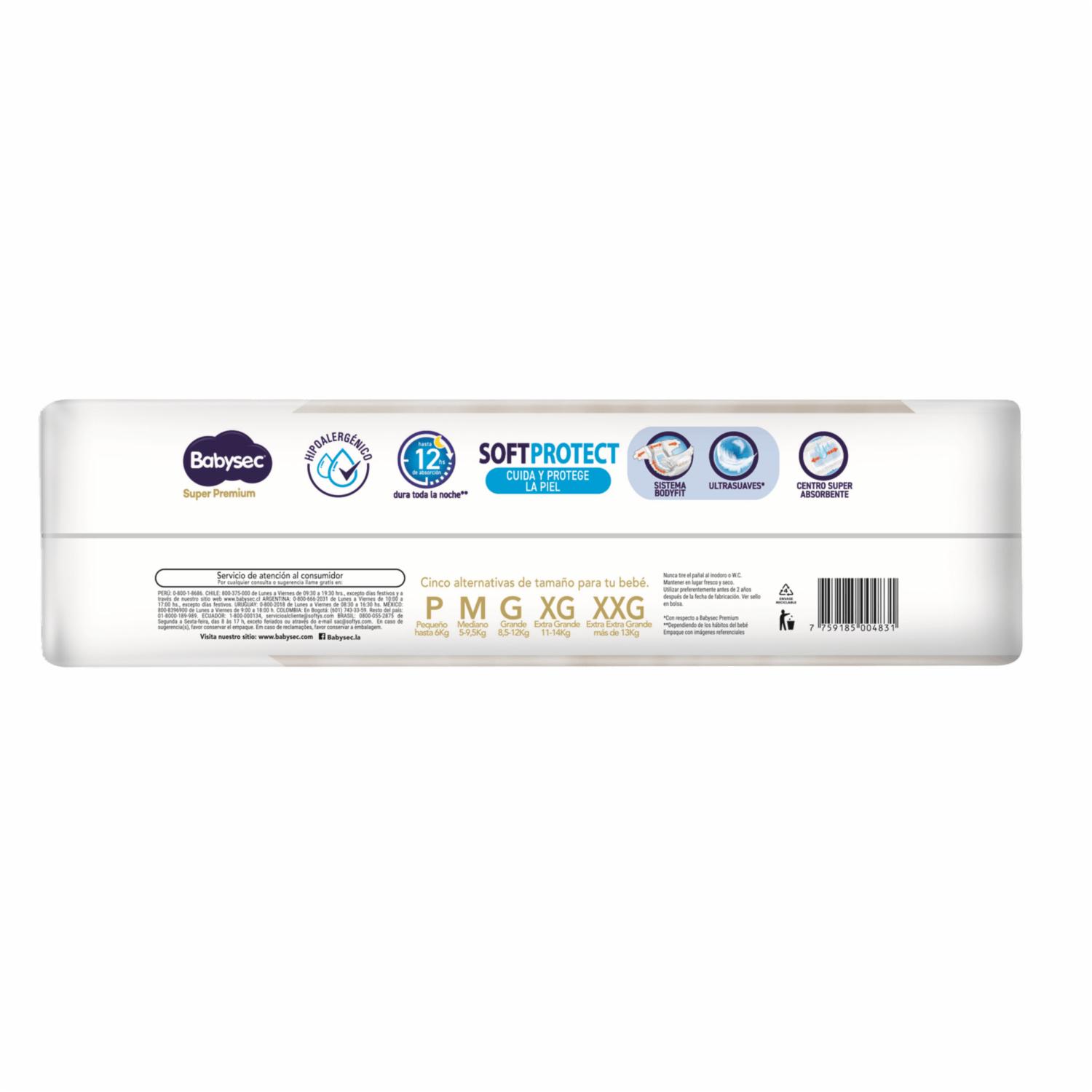 Pañal Babysec Premium con suave cubierta tipo tela y centro su?per absorbente que resistente hasta 12 horas. Sus cintas son reajustables y tiene cintura elástica