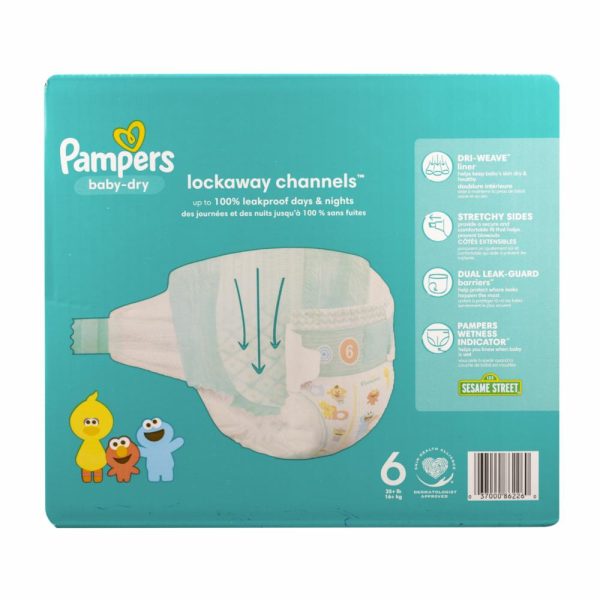 • - Los pañales Baby Dry 12 Horas Etapa 6 de Pampers están diseñados para bebés de 15 kg o más. - Tienen una capacidad de absorción de hasta 12 horas, lo que los hace ideales para usar durante la noche. - Cuentan con una capa extra de absorción que ayuda a mantener la piel del bebé seca y protegida. - Tienen un ajuste cómodo y seguro gracias a sus cintas elásticas y laterales flexibles