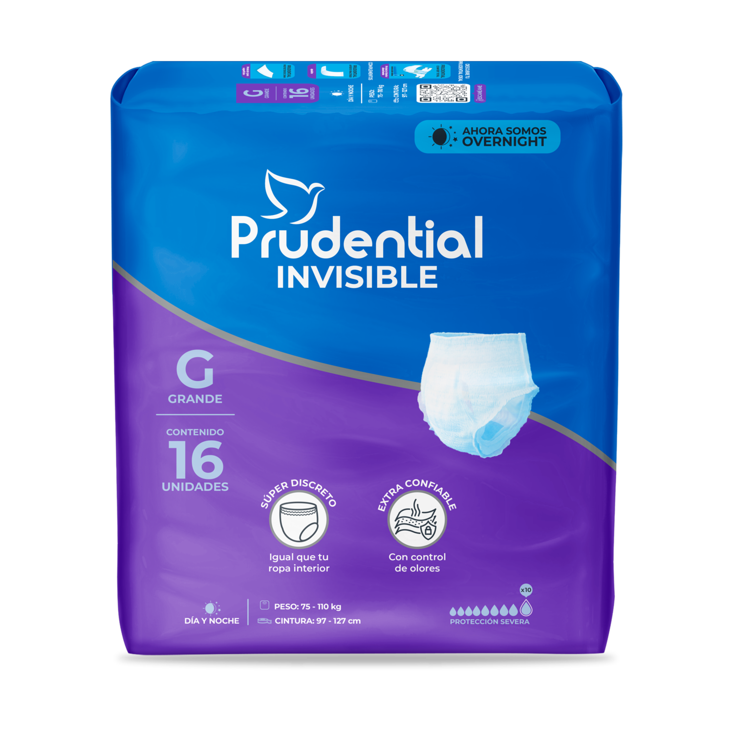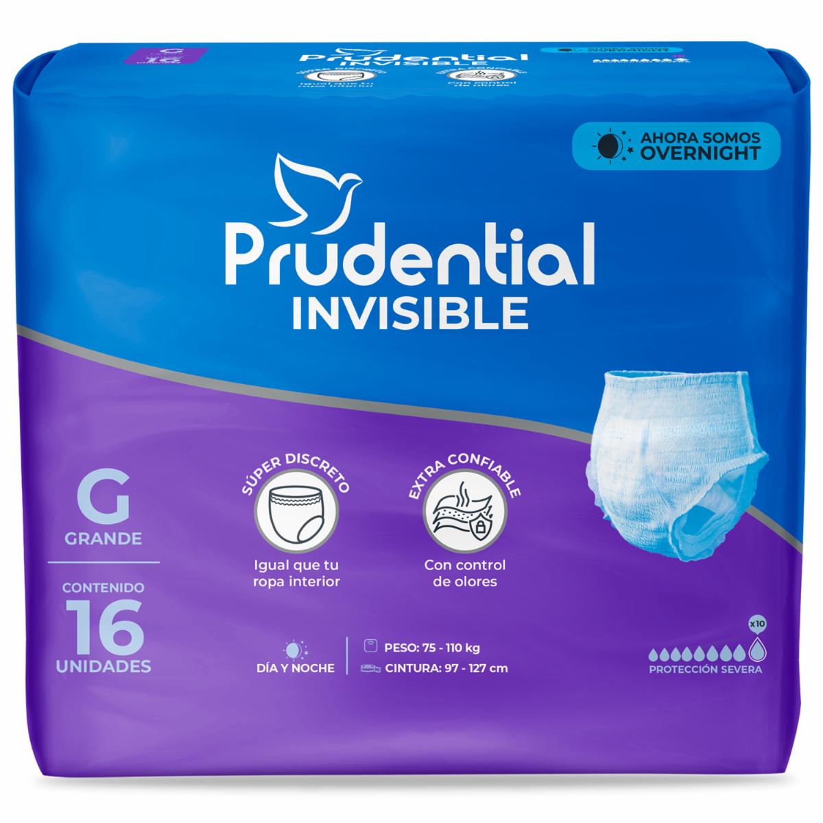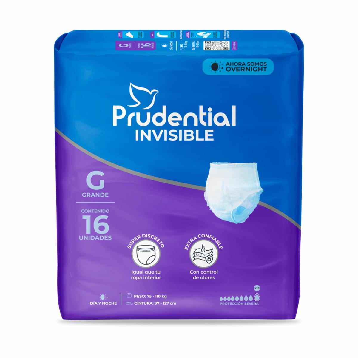 - Prudential Invisible es una ropa interior absorbente diseñada para ofrecer máxima discreción. Con control de olores y un doble núcleo absorbente. Brinda protección severa tanto de día como de noche, ideal para quienes buscan una combinación perfecta de comodidad, seguridad y discreción
