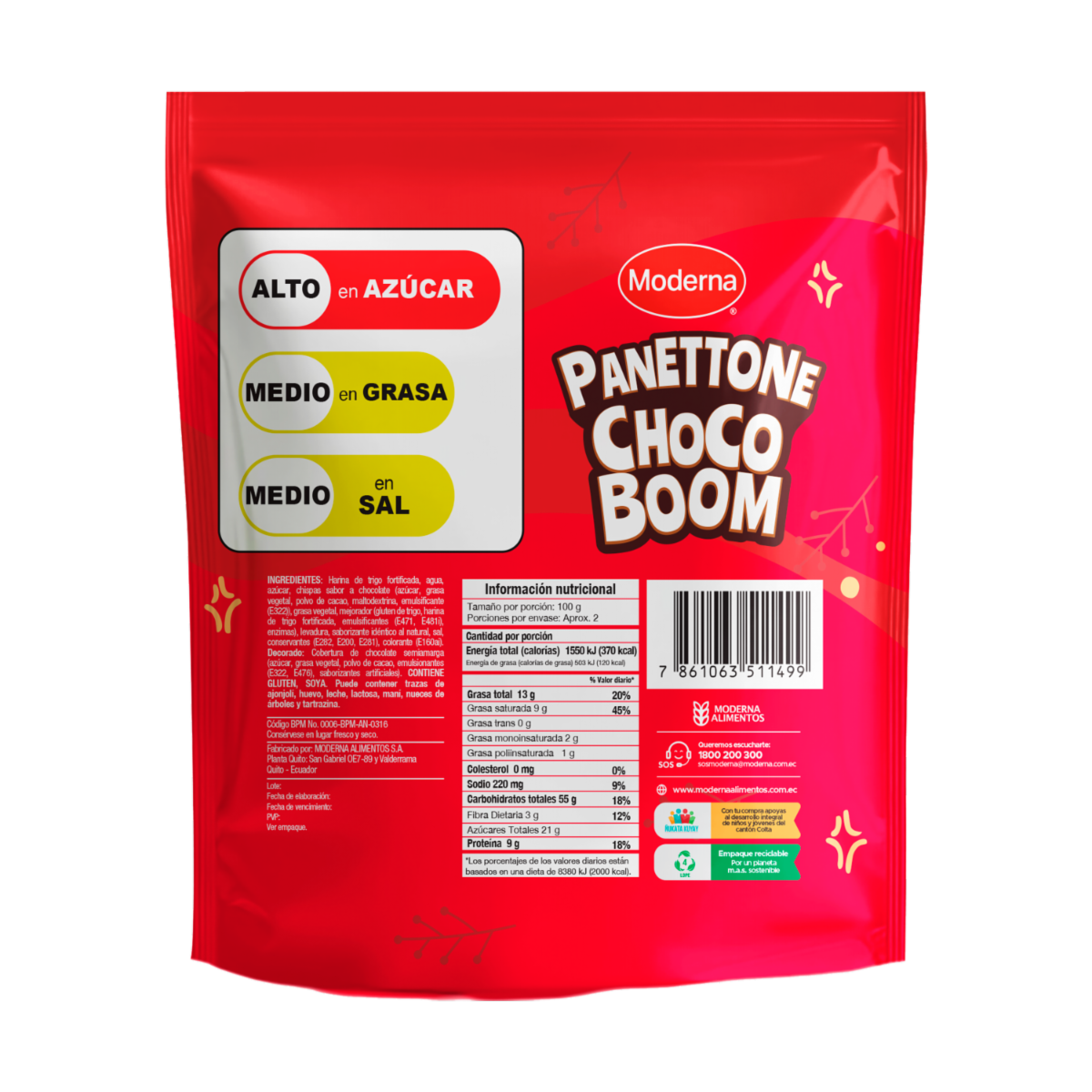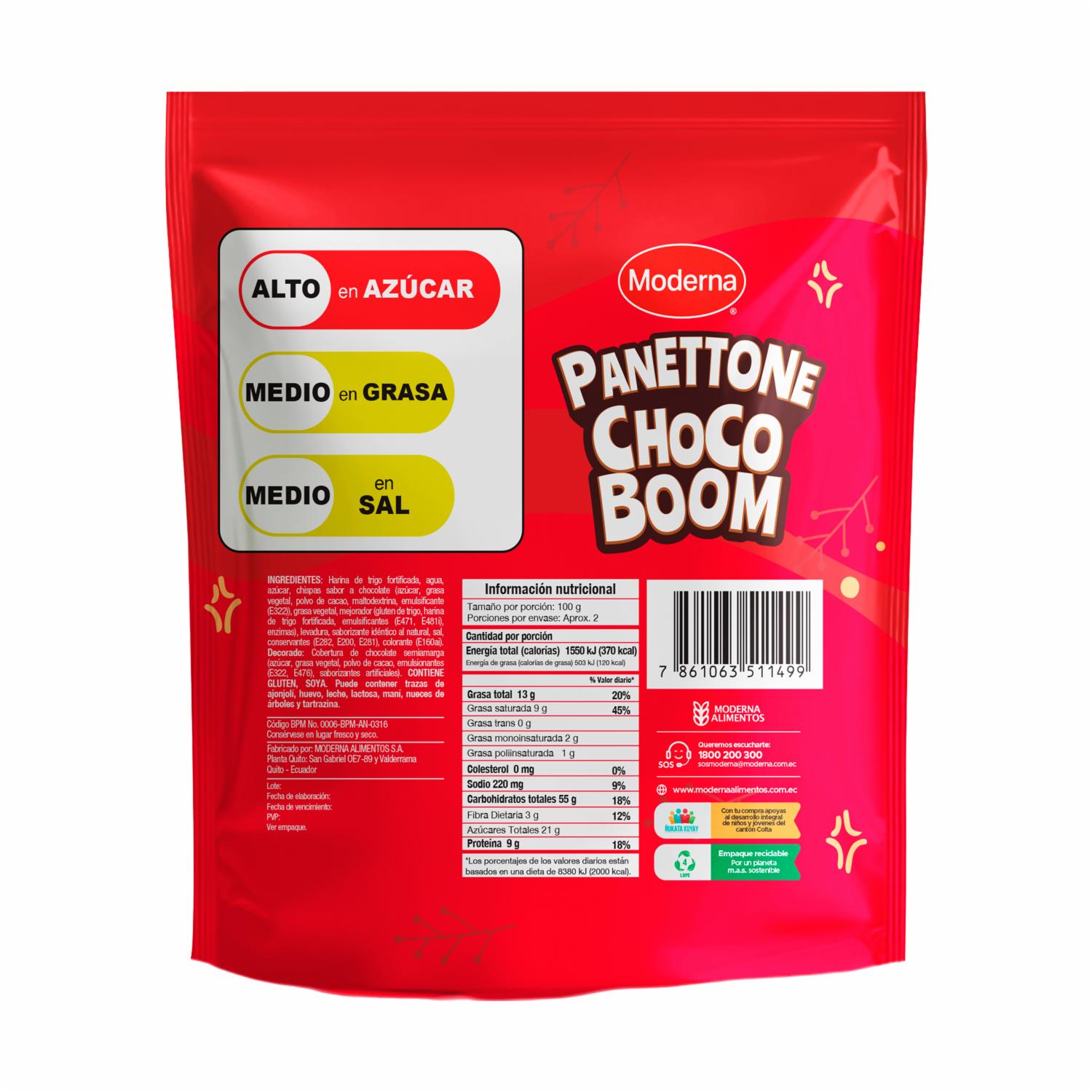 Panettone Chocoboom MODERNA 200 G – MODERNA. Disponible en nuestros locales. Precio y stock pueden variar según la tienda.