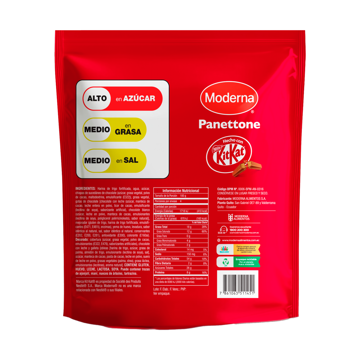 Panettone Kit Kat MODERNA 400 G – MODERNA. Disponible en nuestros locales. Precio y stock pueden variar según la tienda.