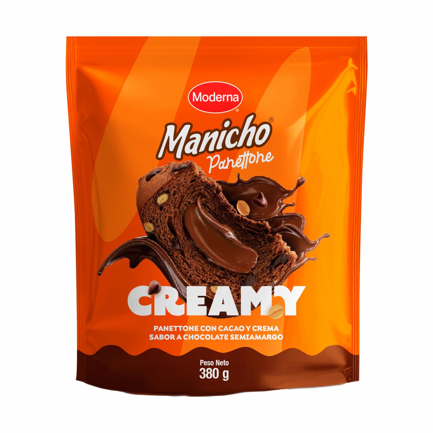 Panettone Manicho Creamy Moderna con chispas y mani en su interior y chocolate inyectado