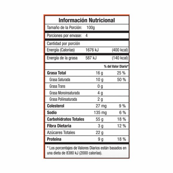 - Harina fortificada, agua, azúcar, kibbles de chocolate. Contiene gluten, lactosa, huevo