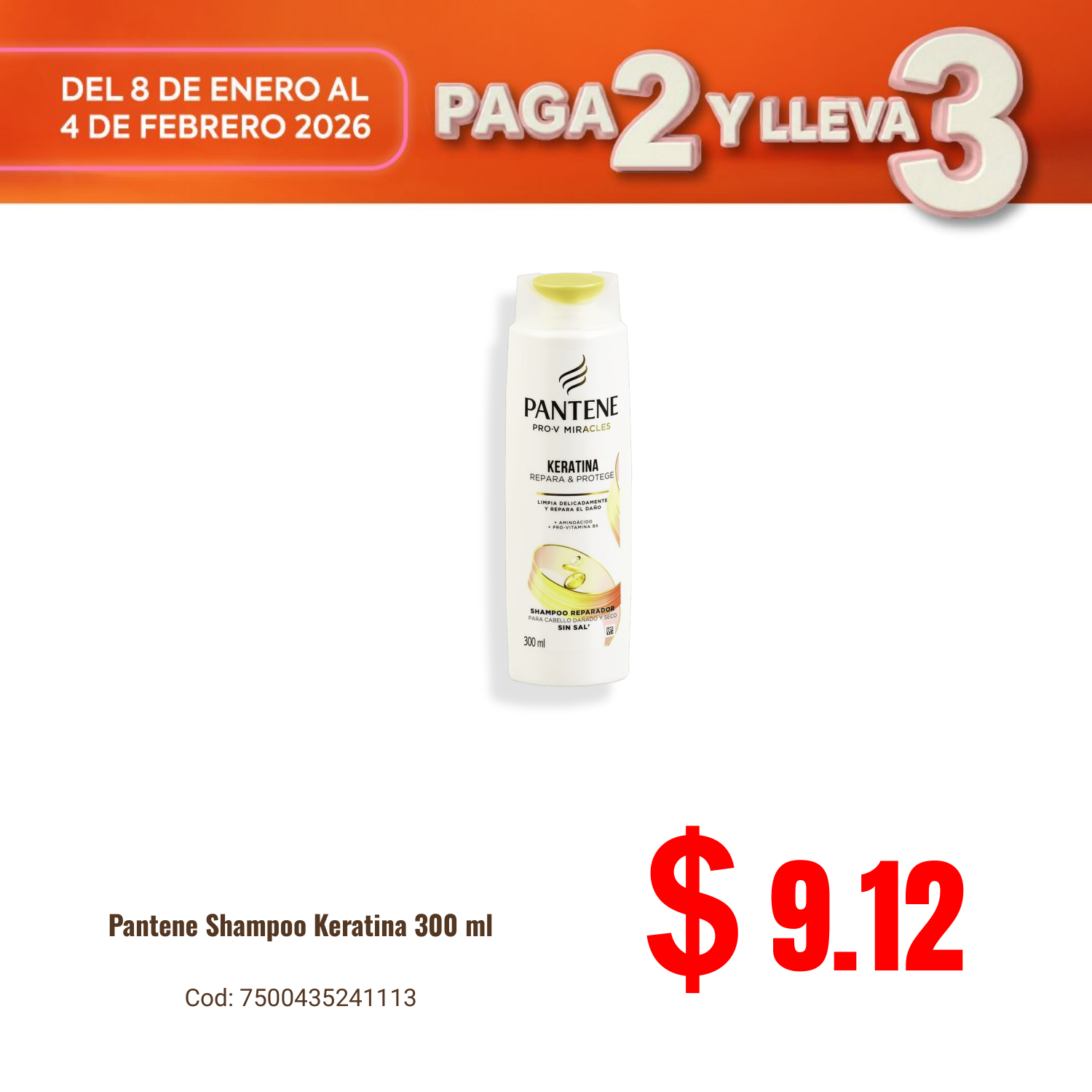 Pantene Shampoo Keratina 300 ml. Disponible en nuestros locales. Precio y stock pueden variar según la tienda.