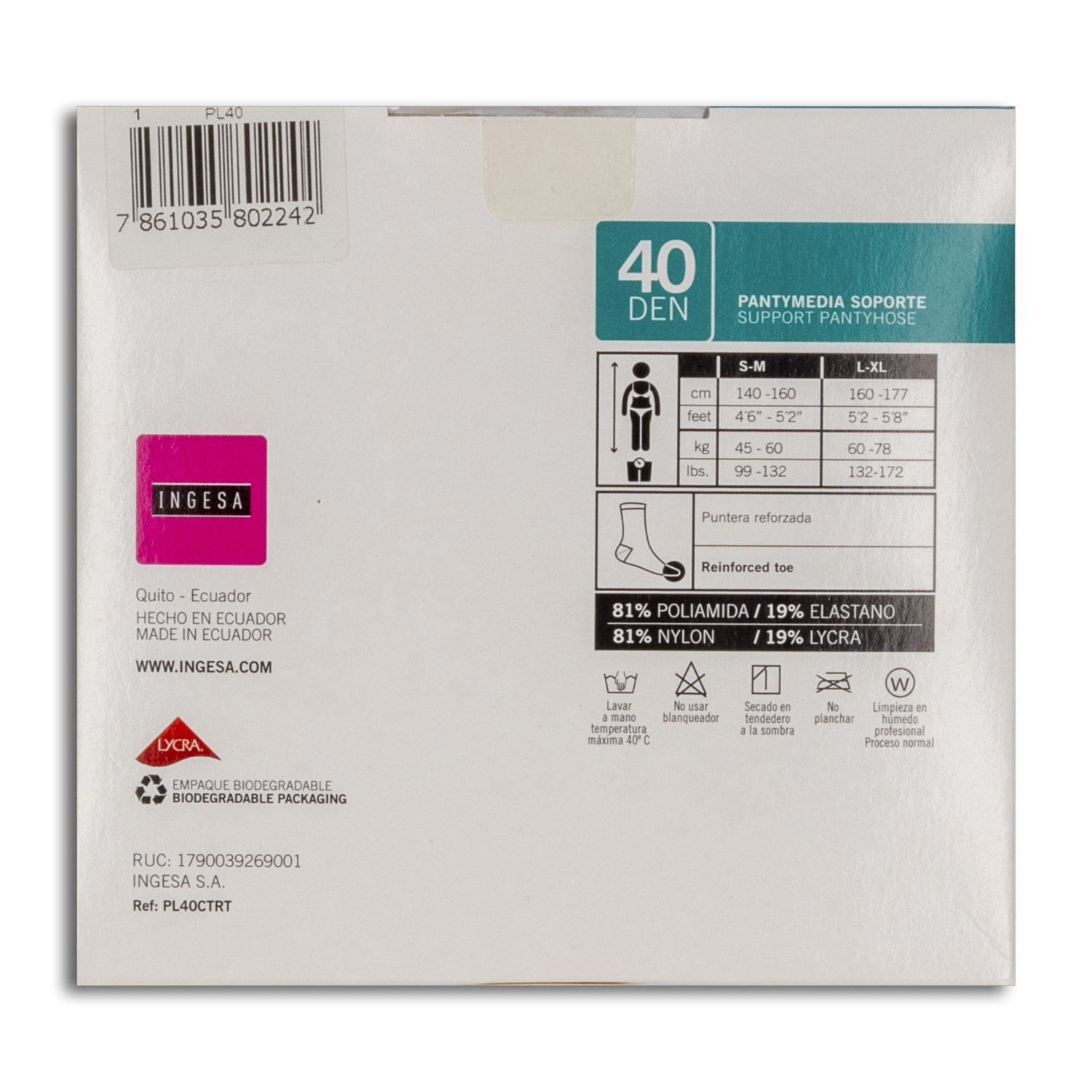 - Panty Medias Lycra Soporte 40 Den de INGESA están diseñadas para brindar mayor confort y apoyo durante todo el día. Confeccionado con lycra de alta calidad, este panty ofrece un ajuste ceñido que modela y soporta la figura de manera cómoda. Ideal para quienes buscan una prenda que proporcione una ligera compresión y soporte adicional, especialmente en la zona del abdomen y las piernas