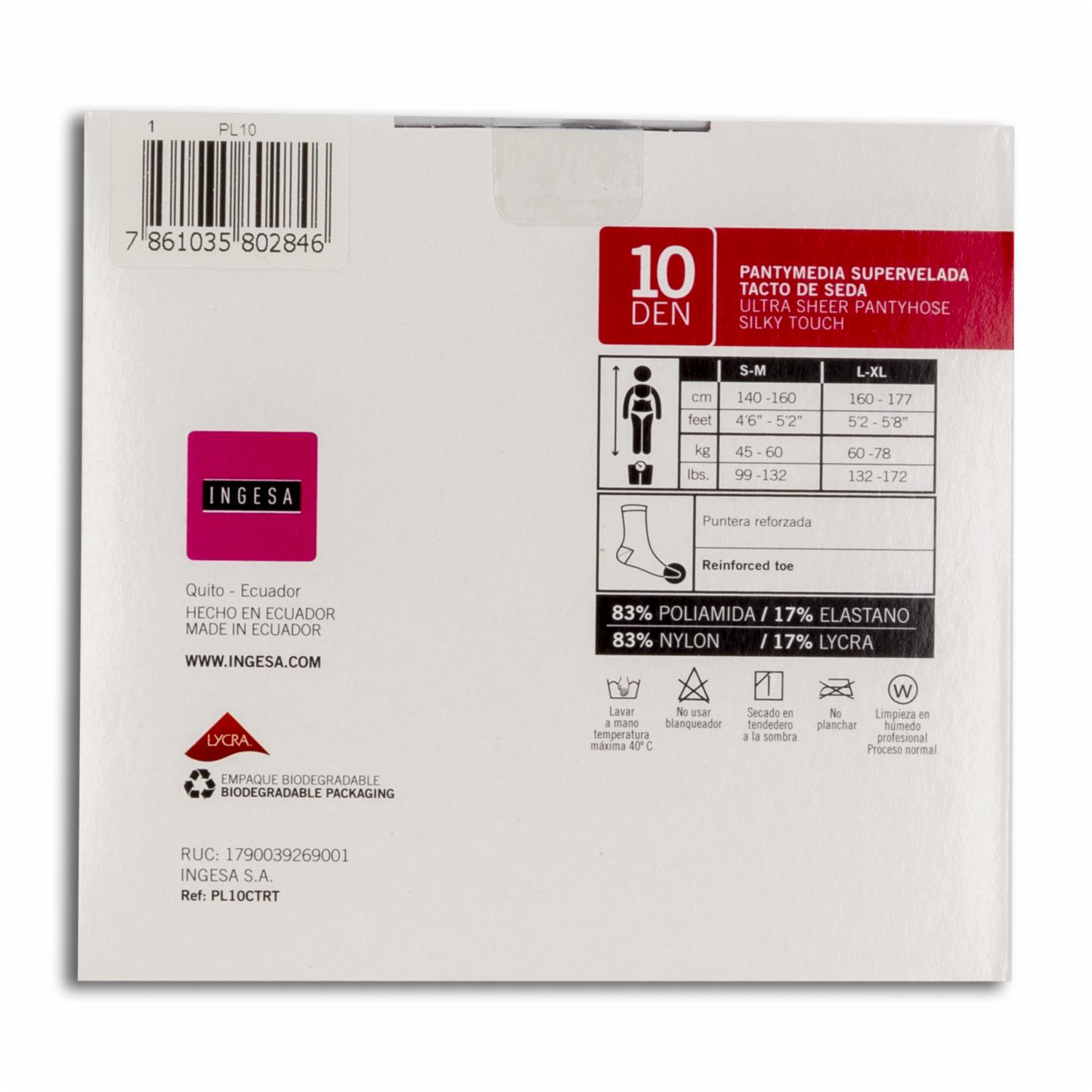 El Panty Media Lycra supervelada 10 Den de INGESA es una prenda ligera y elegante, diseñada para ofrecer un acabado suave y delicado. Su tejido de lycra ultra fina proporciona una apariencia casi invisible, con un toque de suavidad que cuida la piel