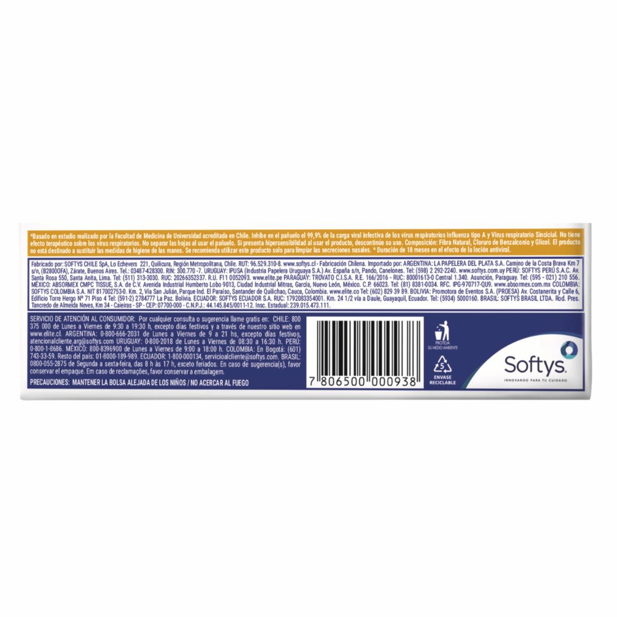- Pañuelo Elite antiviral, producto hipoalergénico de triple hoja para un máximo cuidado de tu piel. Previene el contagio, eliminando en el pañuelo el 99,9% de los virus asociados a la gripe. Ideal para utilizar en meses de invierno!
