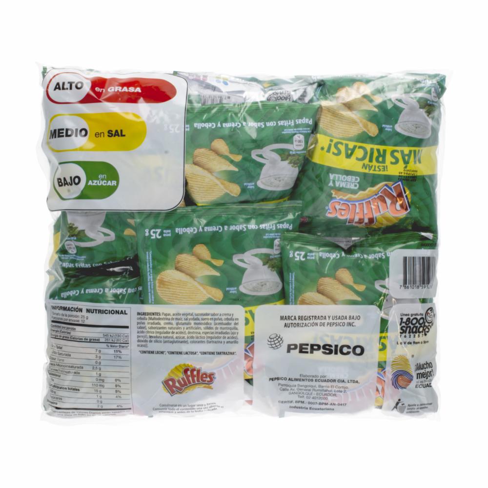 • Estas papas fritas RUFFLES se destacan por su sabor sabroso y su textura crujiente