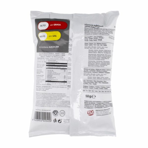 Cada crujiente y dorada papa está impregnada con el delicioso aroma y sabor del jamón ibérico, que ofrece una experiencia culinaria inigualable para los amantes de los sabores gourmet. Disfruta de la combinación perfecta entre la textura crujiente de las papas fritas y la intensidad y exquisitez del jamón ibérico, todo en un práctico paquete de 50g