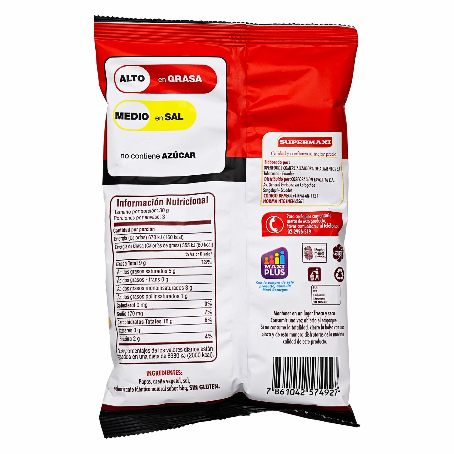 Papas Fritas Sabor Bbq SUPERMAXI 96 g – SUPERMAXI. Disponible en nuestros locales. Precio y stock pueden variar según la tienda.
