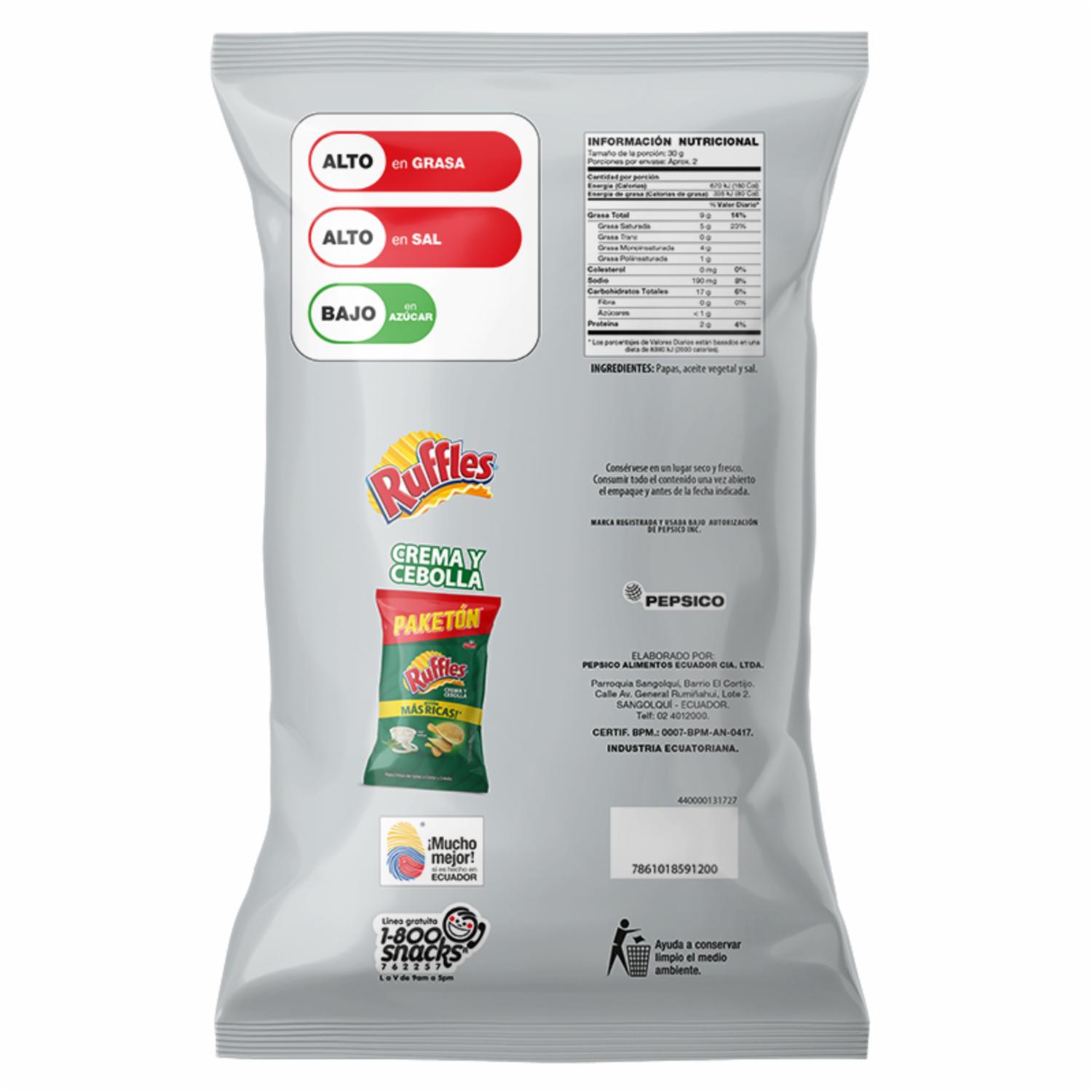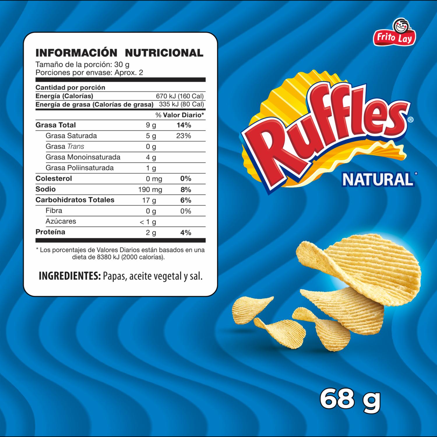 Papas Fritas Sabor Natural RUFFLES 68 G – RUFFLES. Disponible en nuestros locales. Precio y stock pueden variar según la tienda.