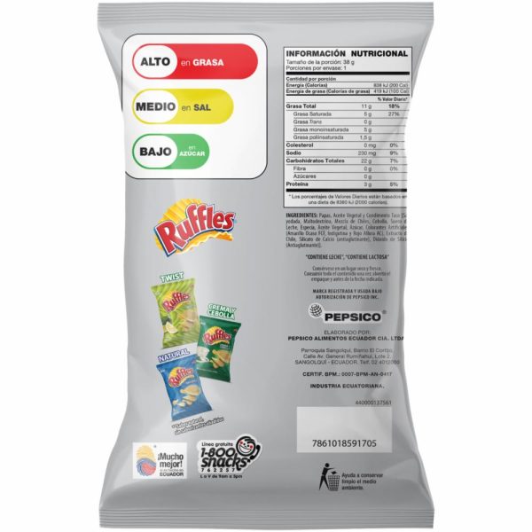 Las papas están cortadas en ondulas que garantizan una experiencia crujiente en cada mordisco.Famosas por su sabor y textura, las papas fritas Ruffles son una opción confiable para los amantes de los snacks
