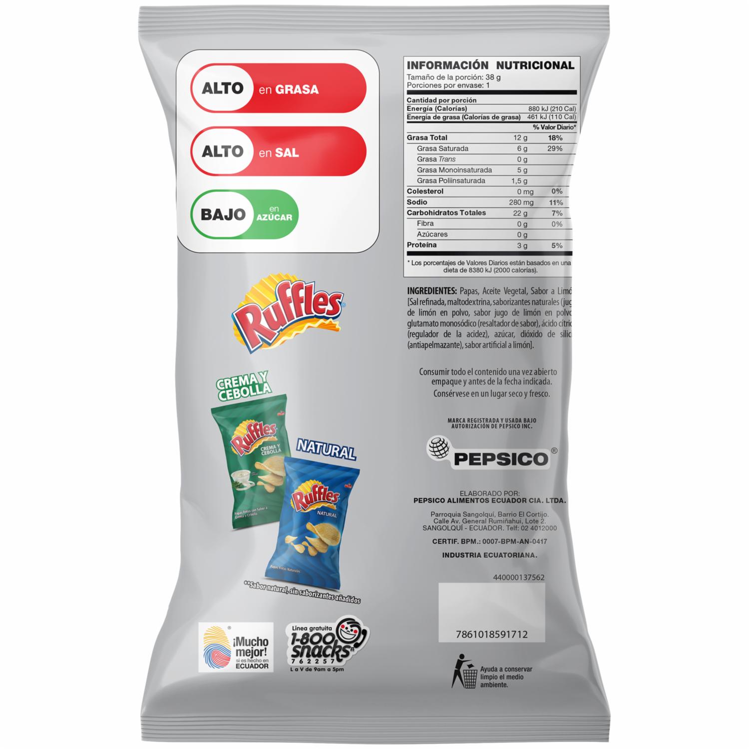 - Las papas están cortadas en ondulas que garantizan una experiencia crujiente en cada mordisco.Famosas por su sabor y textura, las papas fritas Ruffles son una opción confiable para los amantes de los snacks
