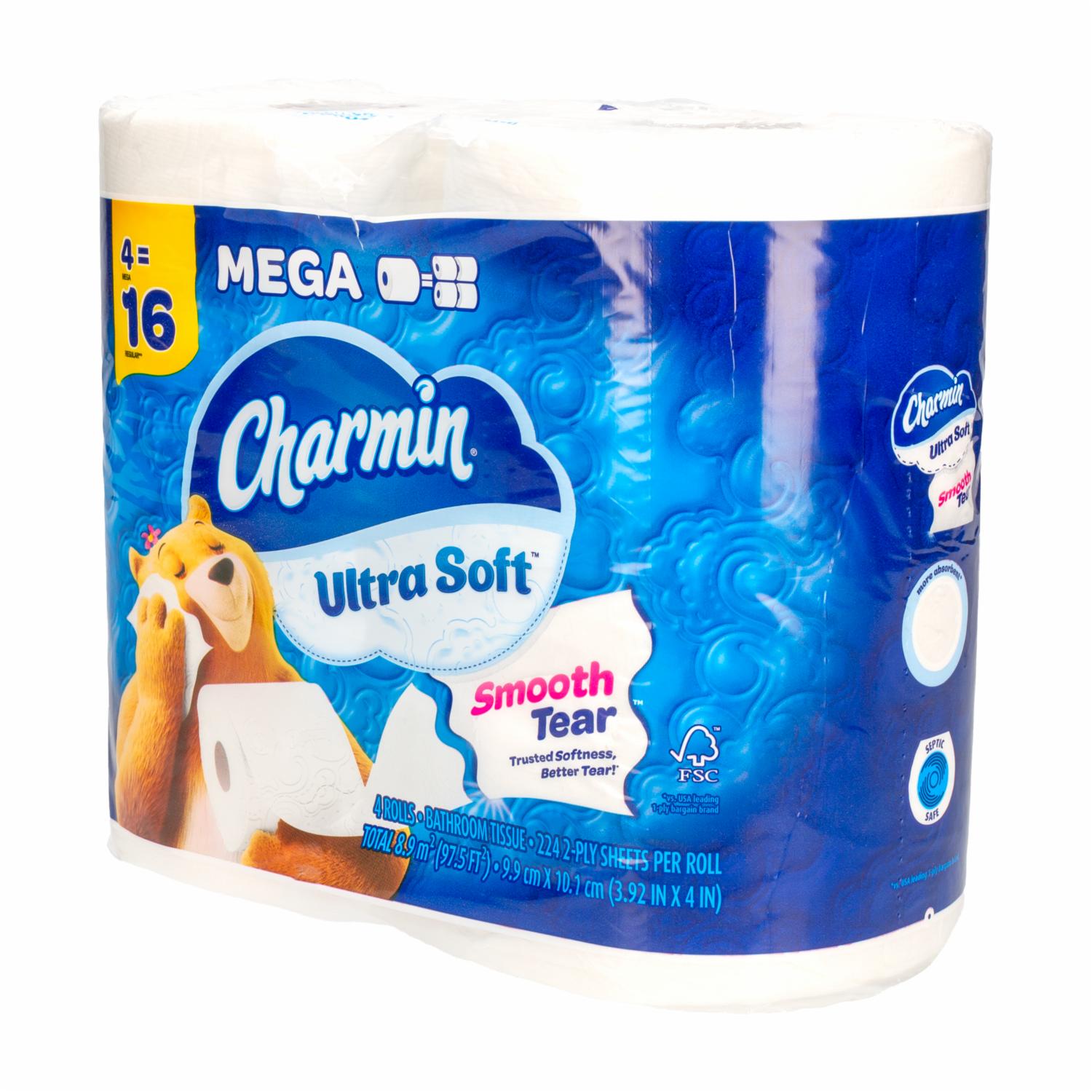 El paquete contiene 4 mega rollos (224 hojas por rollo) de papel higiénico Charmin Ultra Soft. Suavidad irresistible que puedes sentir