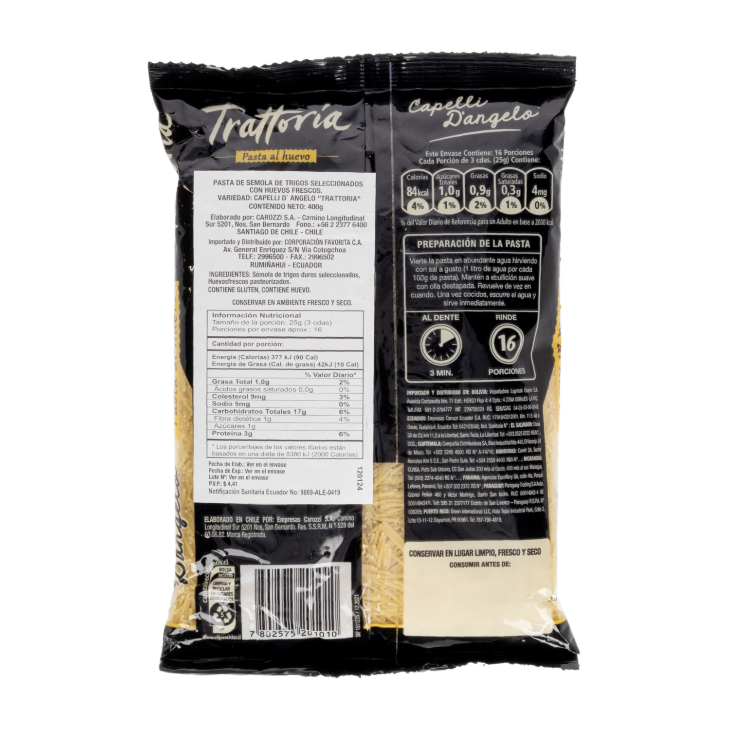 - Pasta Cabellos de Ángel elaborado con pasta de sémola de trigos seleccionados con huevos frescos. Pasta Gourmet libre de lactosa