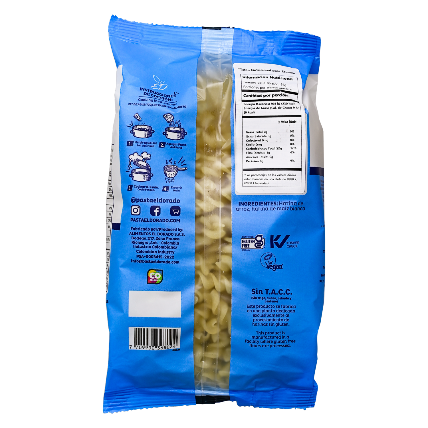 - Pasta 100% natural libre de gluten y elaborada con métodos artesanales. Un producto apto para veganos, bajo en sodio, libre de transgénicos y rico en fibra. Fabricado en una planta dedicada exclusivamente al procesamiento de harinas sin gluten. No contiene trigo, avena, cebada ni centeno