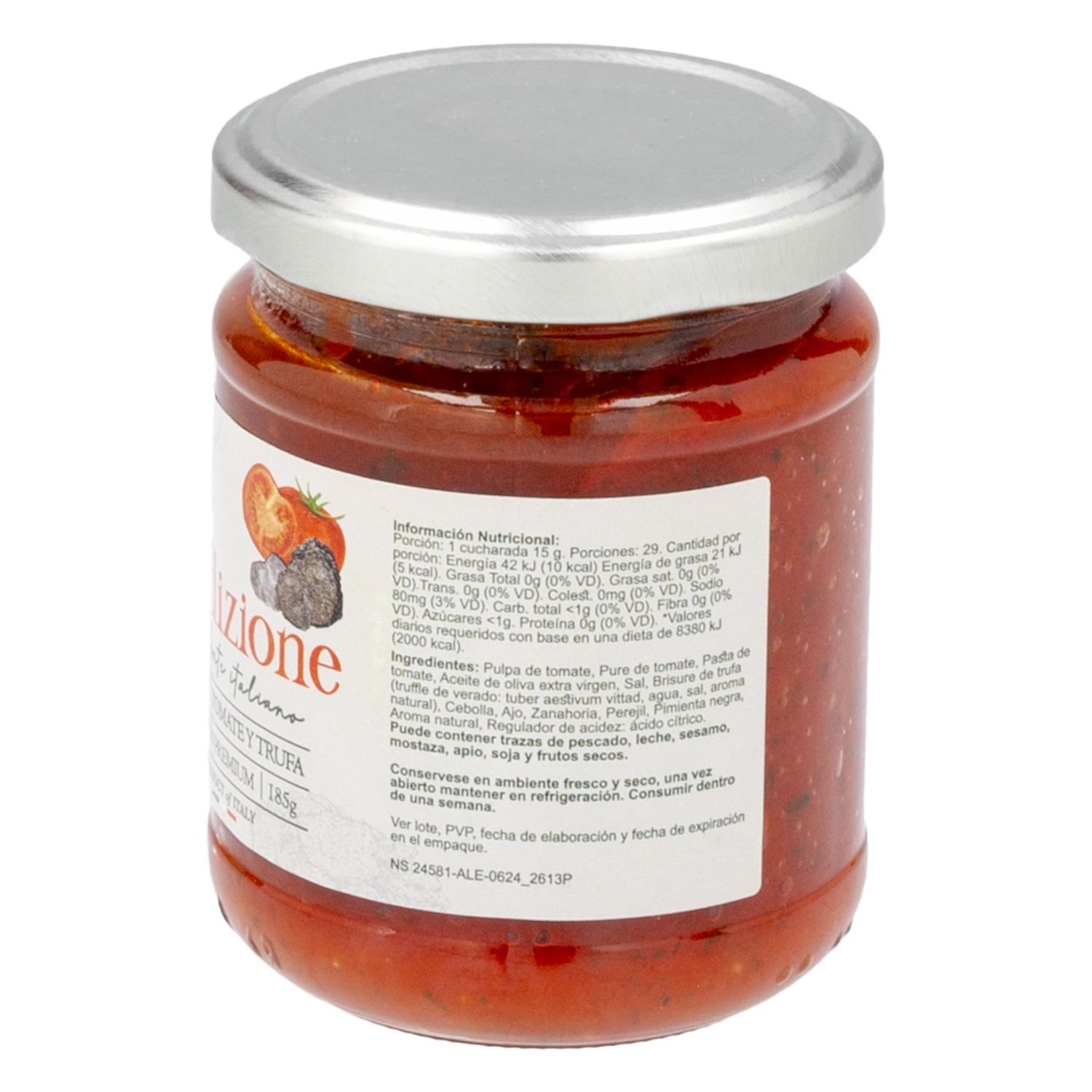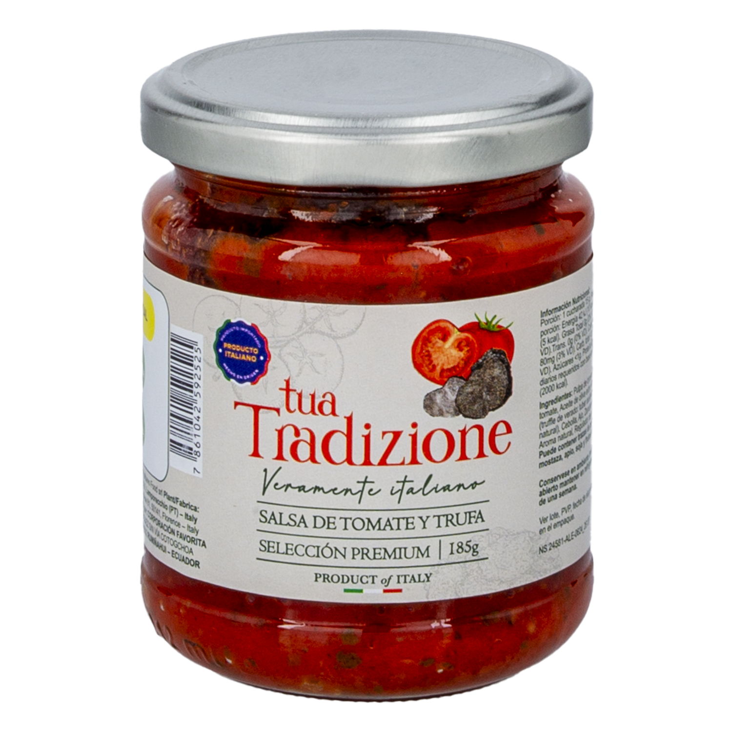 - La Pasta de Tomate con Trufa Tua Tradizione 185 g combina la intensidad del tomate maduro con el aroma sofisticado de la trufa. Perfecta para realzar pastas, carnes o risottos, aporta un toque gourmet y elegante a tus preparaciones. Una experiencia de sabor única que transforma cualquier plato en algo extraordinario