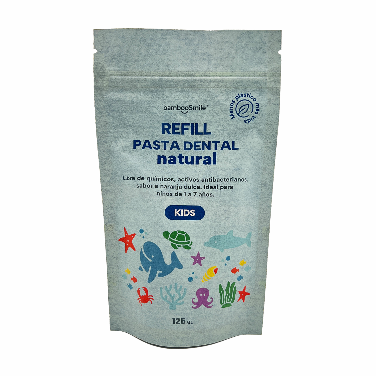 - Refill ecológico para envases de vidrio, diseñado para la higiene dental infantil (1-7 años). Fórmula 100% natural y libre de flúor, enriquecida con aceite esencial de naranja dulce de propiedades antimicrobianas. Su textura espumosa, basada en bicarbonato, carbonato de calcio y caolín, limpia suavemente eliminando placa sin dañar el esmalte y favorece la remineralización dental. Una opción sostenible que reduce plástico y costos sin comprometer la salud bucal