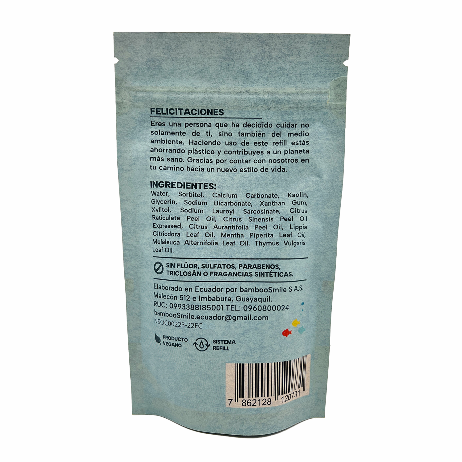Refill ecológico para envases de vidrio, diseñado para la higiene dental infantil (1-7 años). Fórmula 100% natural y libre de flúor, enriquecida con aceite esencial de naranja dulce de propiedades antimicrobianas. Su textura espumosa, basada en bicarbonato, carbonato de calcio y caolín, limpia suavemente eliminando placa sin dañar el esmalte y favorece la remineralización dental. Una opción sostenible que reduce plástico y costos sin comprometer la salud bucal