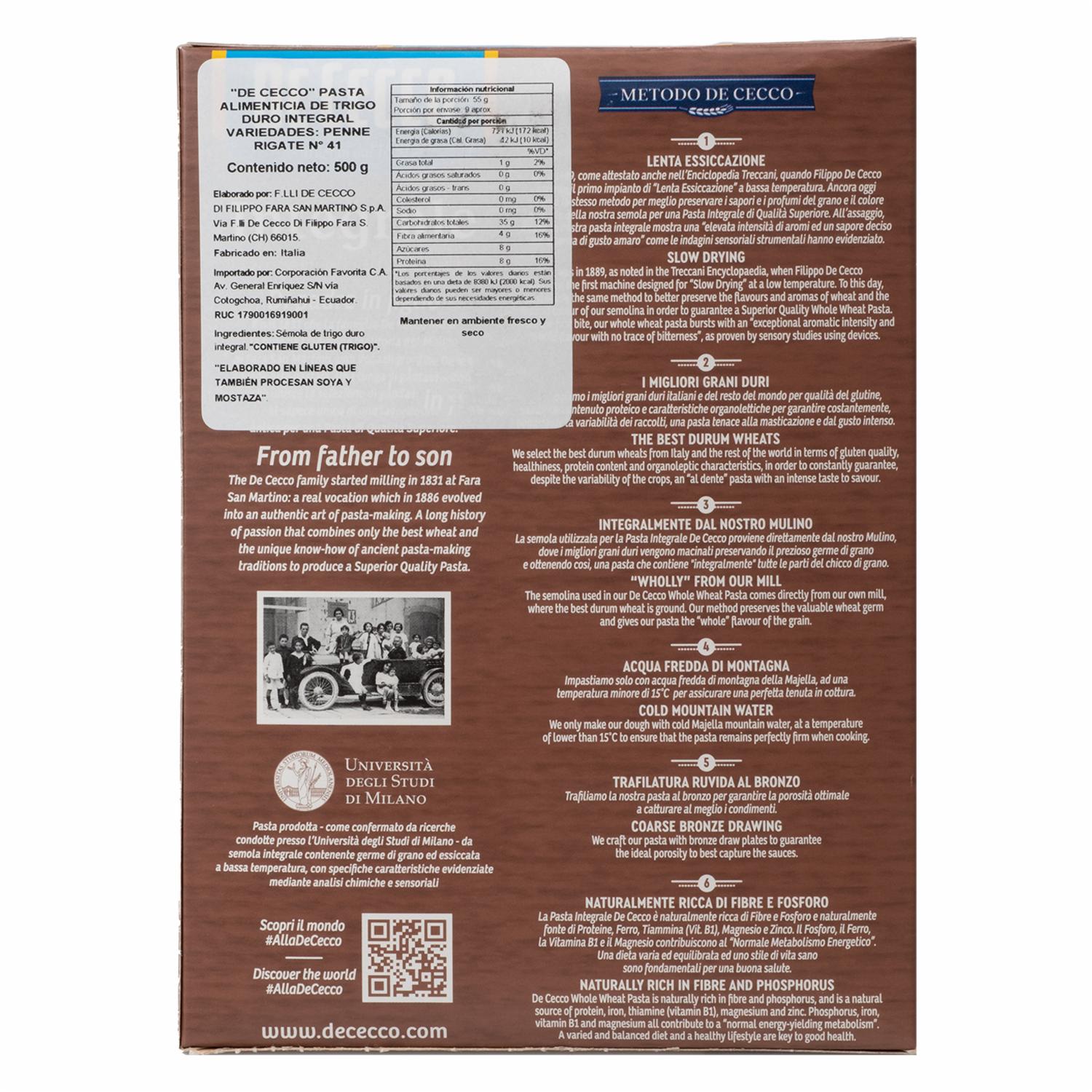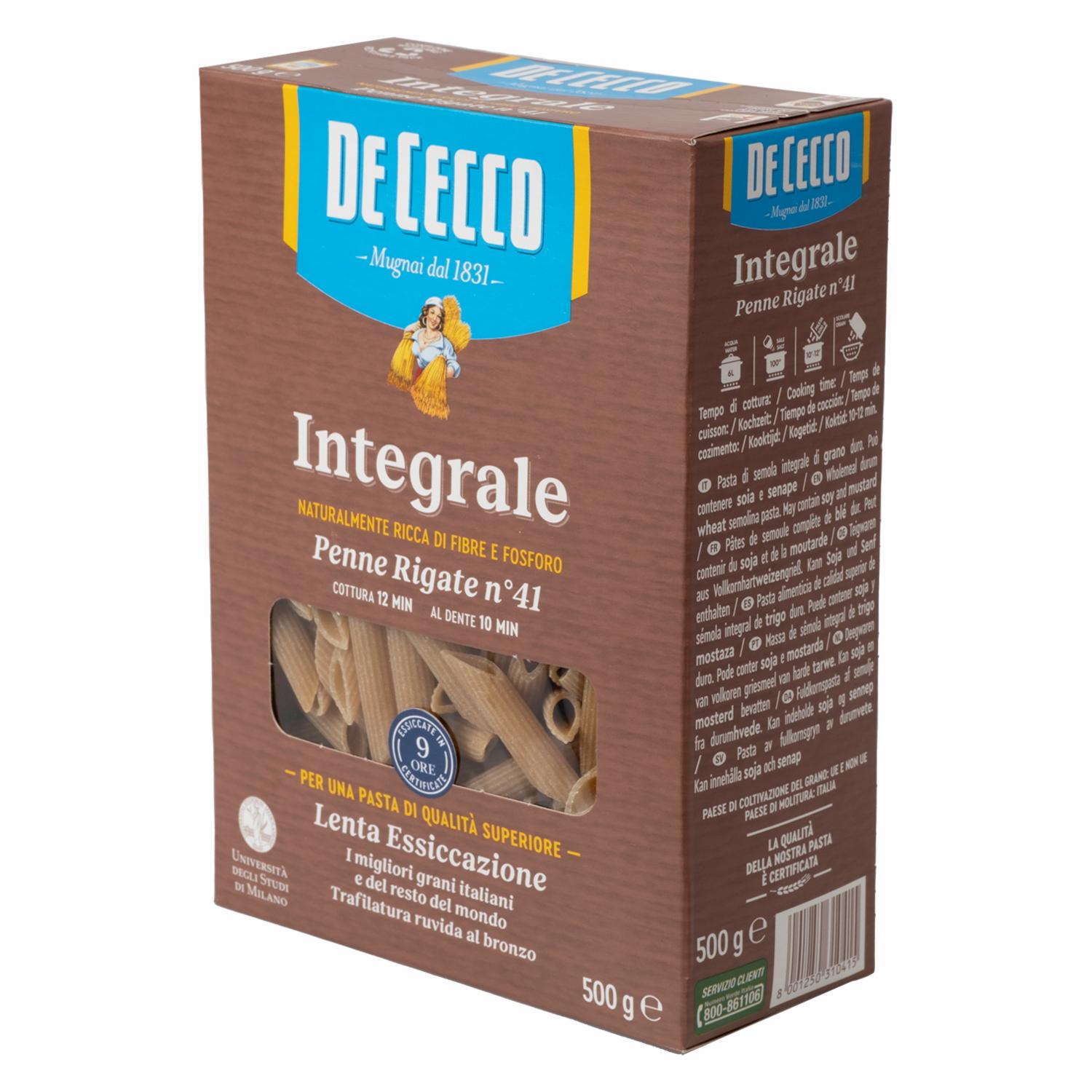 Pasta Integral Penne Rigate DE CECCO 500 g – DE CECCO. Disponible en nuestros locales. Precio y stock pueden variar según la tienda.