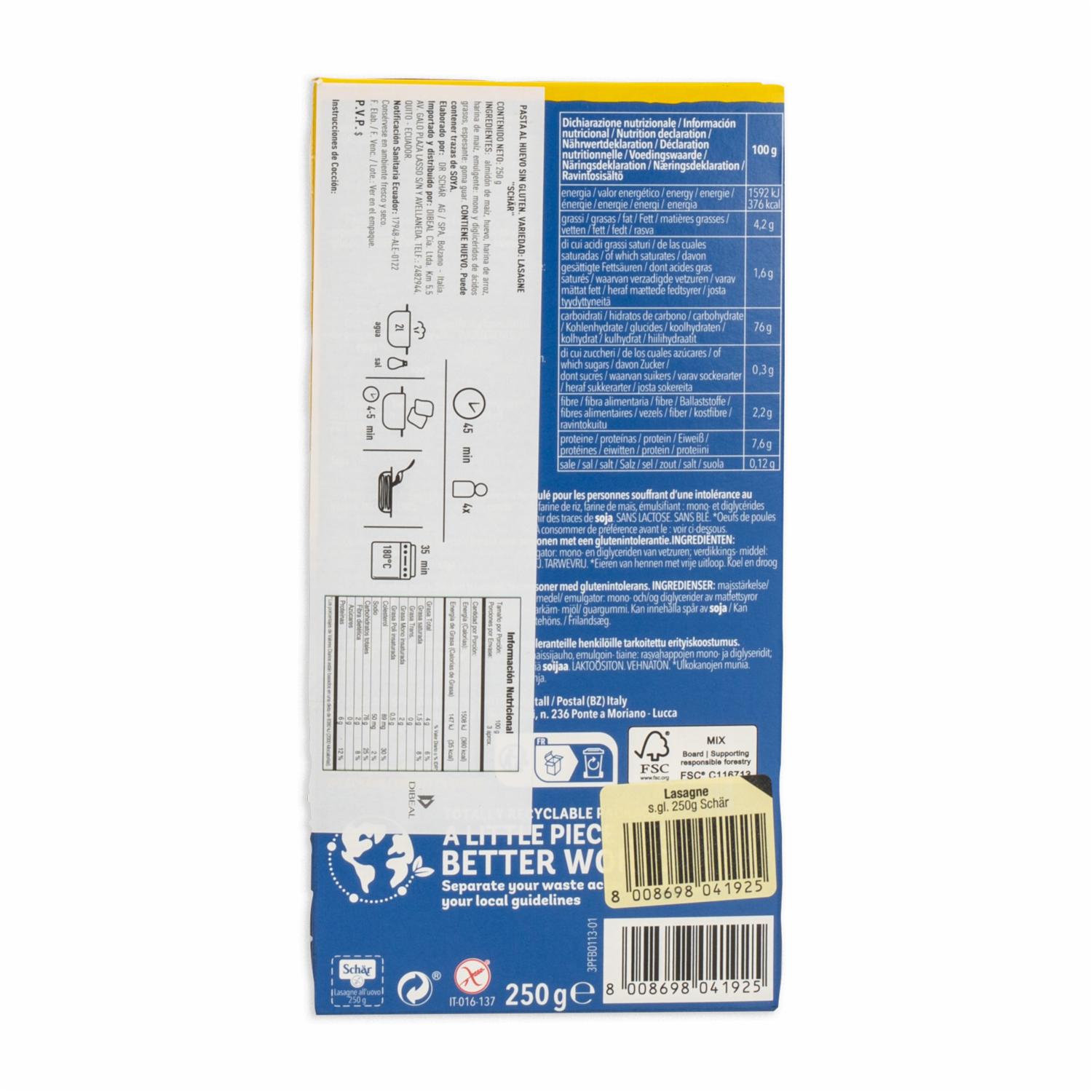 consultando preciosPasta Lasagne SCHÄR 250 G – SCHÄR. Disponible en nuestros locales. Precio y stock pueden variar según la tienda.